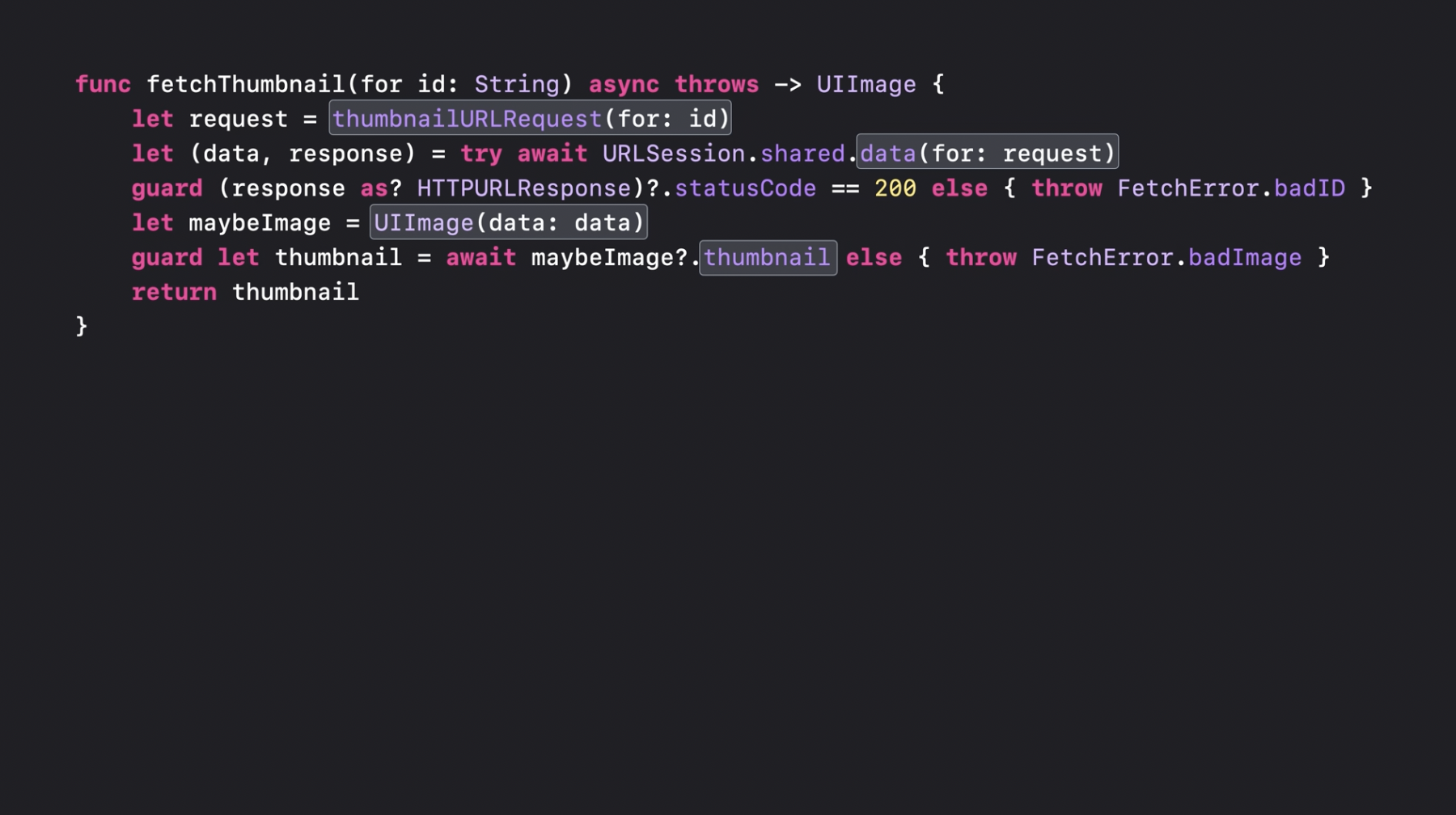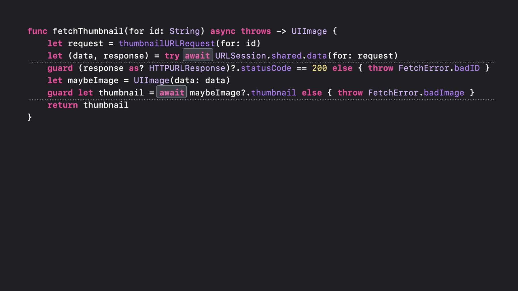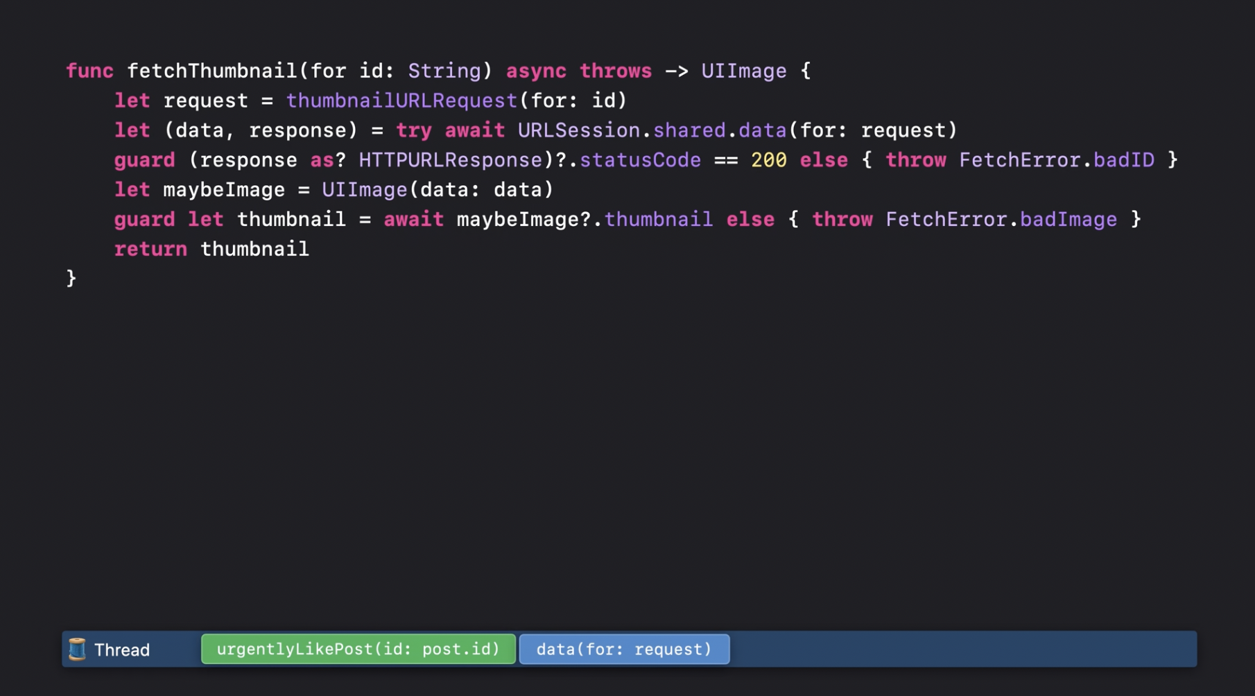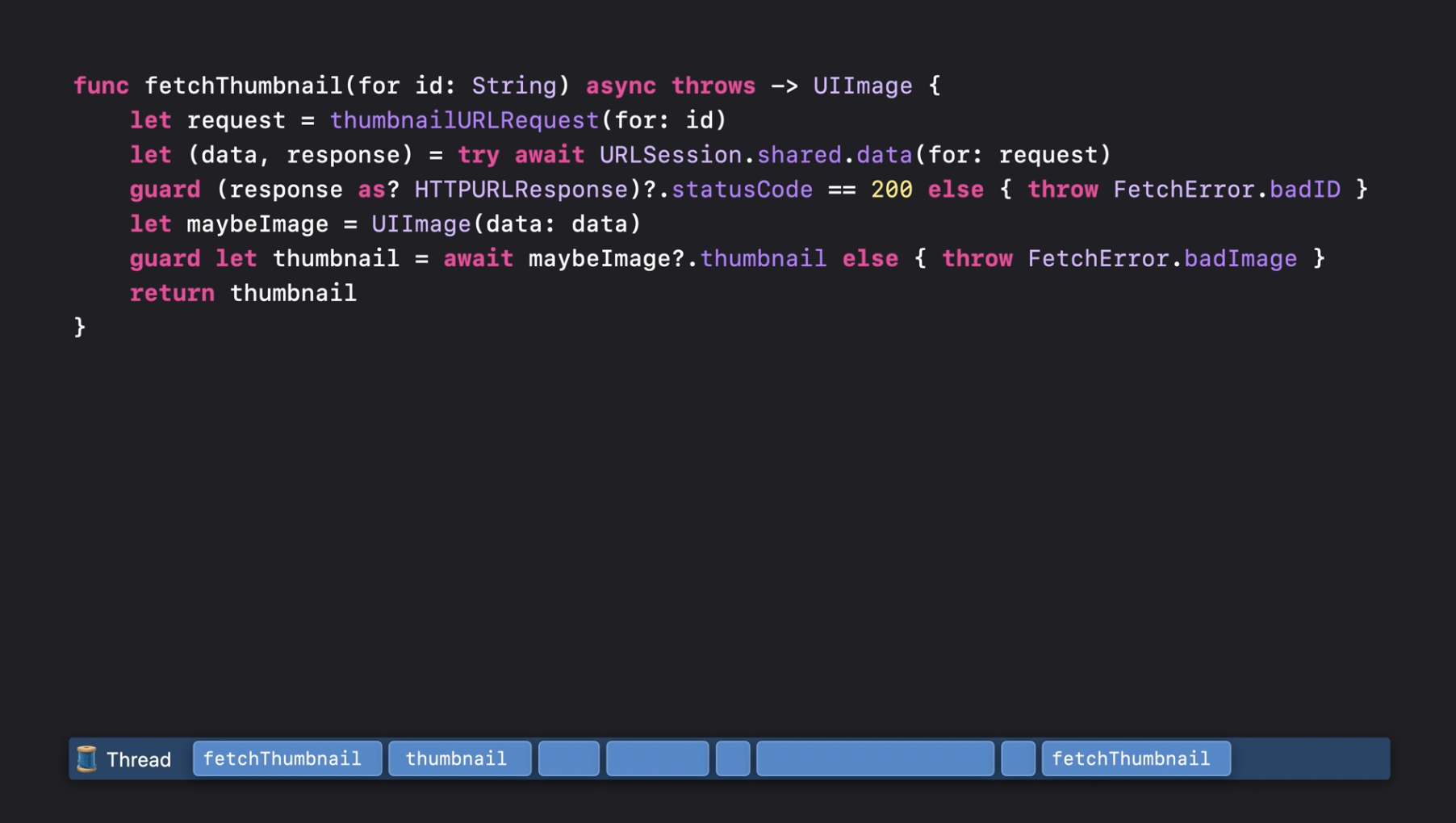 이 함수는 여전히 문자열을 인수로 받습니다. 하지만 이전에는 완료 핸들러도 함께 전달해야 했던 반면, 이번에는 함수가 async로 선언되었습니다. 함수를 async로 선언할 때는, 함수 선언부에서 throws 키워드가 있다면 그 앞에 async를 추가해야 합니다. 만약 throws가 없다면, 반환 타입의 앞에 async를 붙이면 됩니다. 함수를 async로 선언하면 코드와 함수 선언부가 훨씬 간결해집니다. 썸네일 생성이 성공하면, 단순히 그 이미지를 반환하면 되고, 오류가 발생하면 throw를 사용해 던지기만 하면 됩니다. 이제 fetchThumbnail이 호출되면, 이전과 마찬가지로 thumbnailURLRequest를 먼저 호출합니다. 이 함수는 동기적인 함수이므로, 실행되는 동안 스레드는 블로킹됩니다.