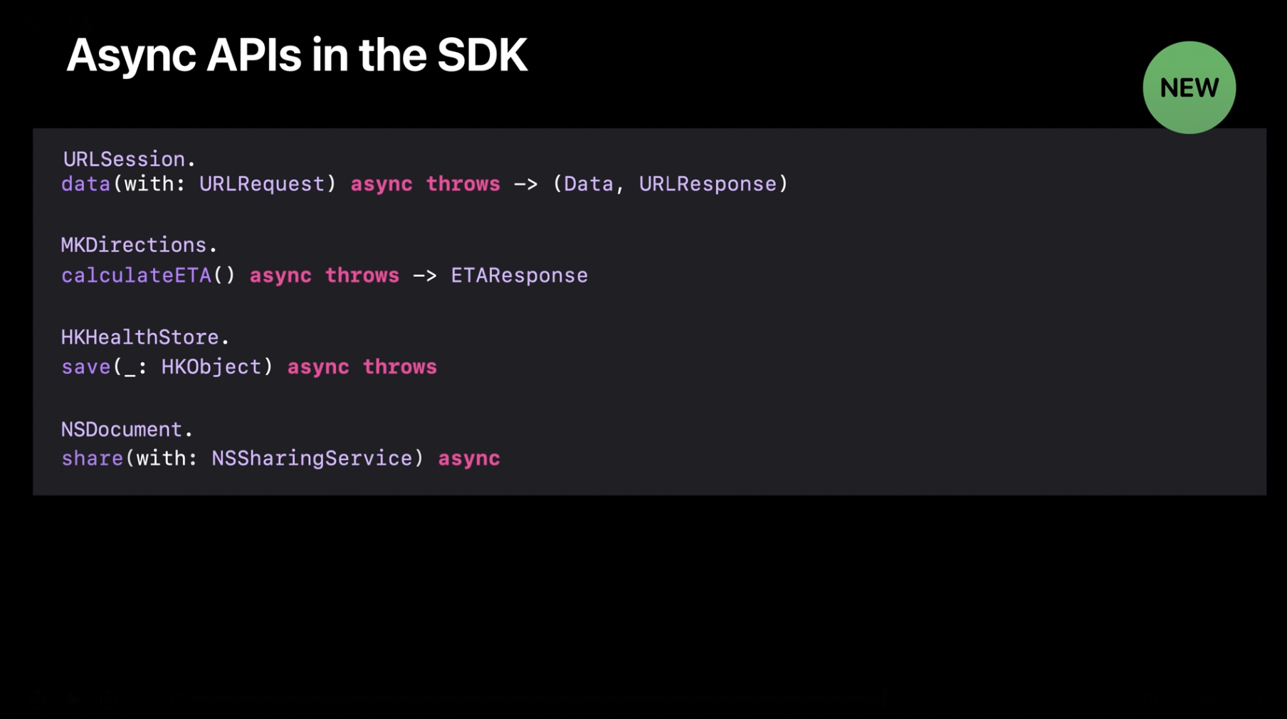 이제 fetchThumbnail 함수를 호출하던 모든 곳에서 마이그레이션을 완료했습니다. 하지만 우리 앱에는 async/await를 적용할 수 있는 더 많은 코드가 남아 있습니다. 빠르게 시작하려면, 기존 API에 새로운 비동기 코드를 점진적으로 도입하는 것이 좋습니다. SDK에는 수백 개의 API가 제공되며, 이 API들은 비동기적으로 작업을 수행하기 위해 완료 핸들러를 사용합니다. 이러한 API들을 나란히 비교해 보면, 일정한 패턴이 보이기 시작할 것입니다.