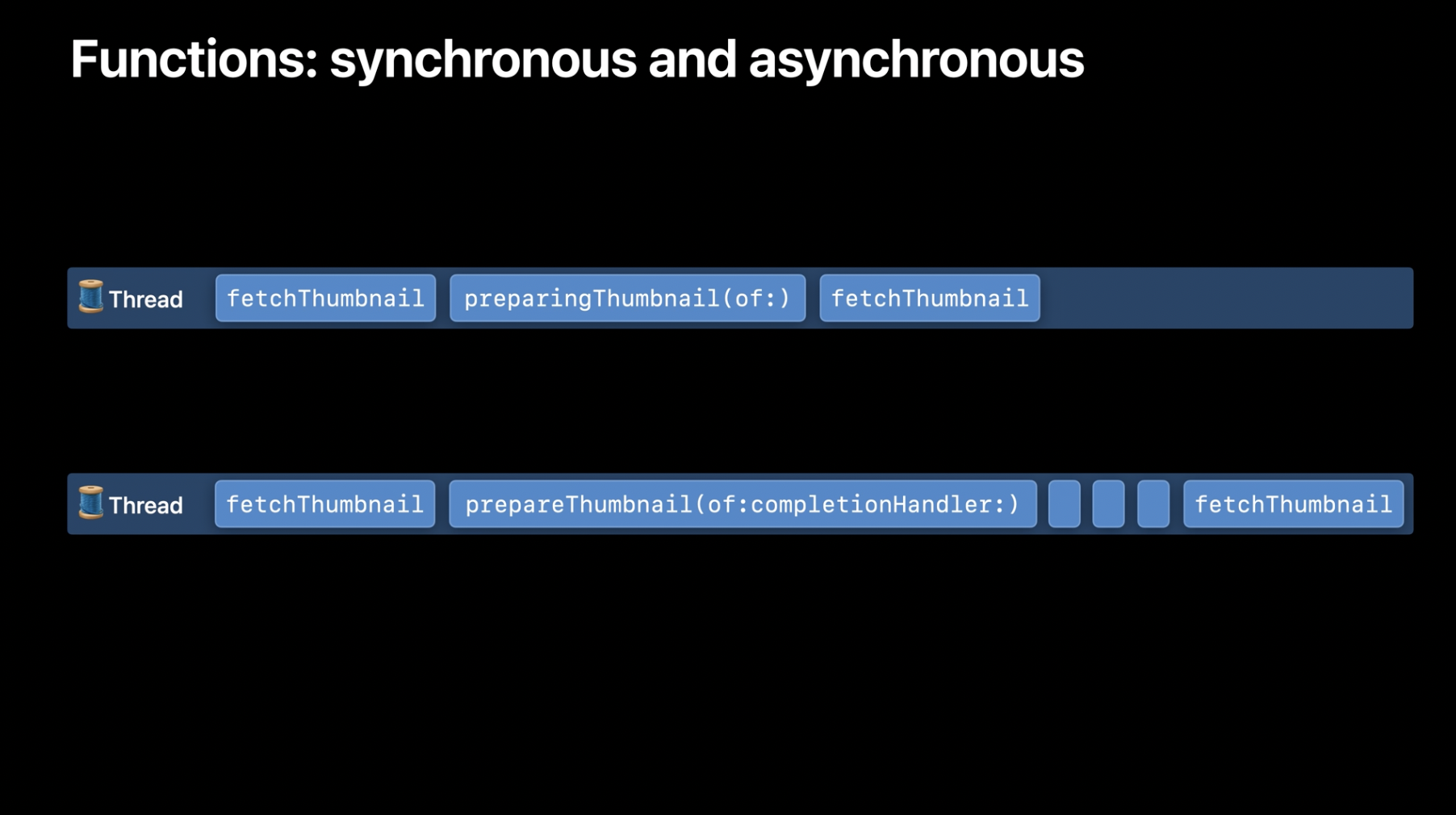 반면, 비동기 버전인 prepareThumbnail(of:completionHandler:)을 호출하면 함수가 실행되는 동안에도 스레드는 다른 작업을 수행할 수 있습니다. 그리고 실행이 완료되면, 함수가 완료 핸들러(completion handler)를 호출하여 완료 사실을 알려줍니다.