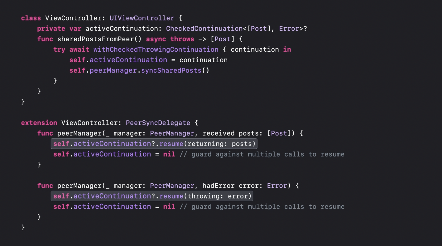 CheckContinuation의 API 계약을 준수하기 위해서 반드시 컨티뉴에이션을 재개한 후 nil로 설정하여 한 번 이상 호출하는 실수를 방지해야 합니다. 항상 기억하세요. 여기서 컨티뉴에이션 값은 해당 API의 비동기 호출을 수동으로 재개할 수 있는 기능을 나타내므로, 모든 경로에서 반드시 호출되어야 합니다. 만약 델리게이트 API가 여러 번 호출되거나 특정 상황에서 전혀 호출되지 않는다면, 컨티뉴에이션을 정확히 한 번만 재개하는 것이 매우 중요합니다.