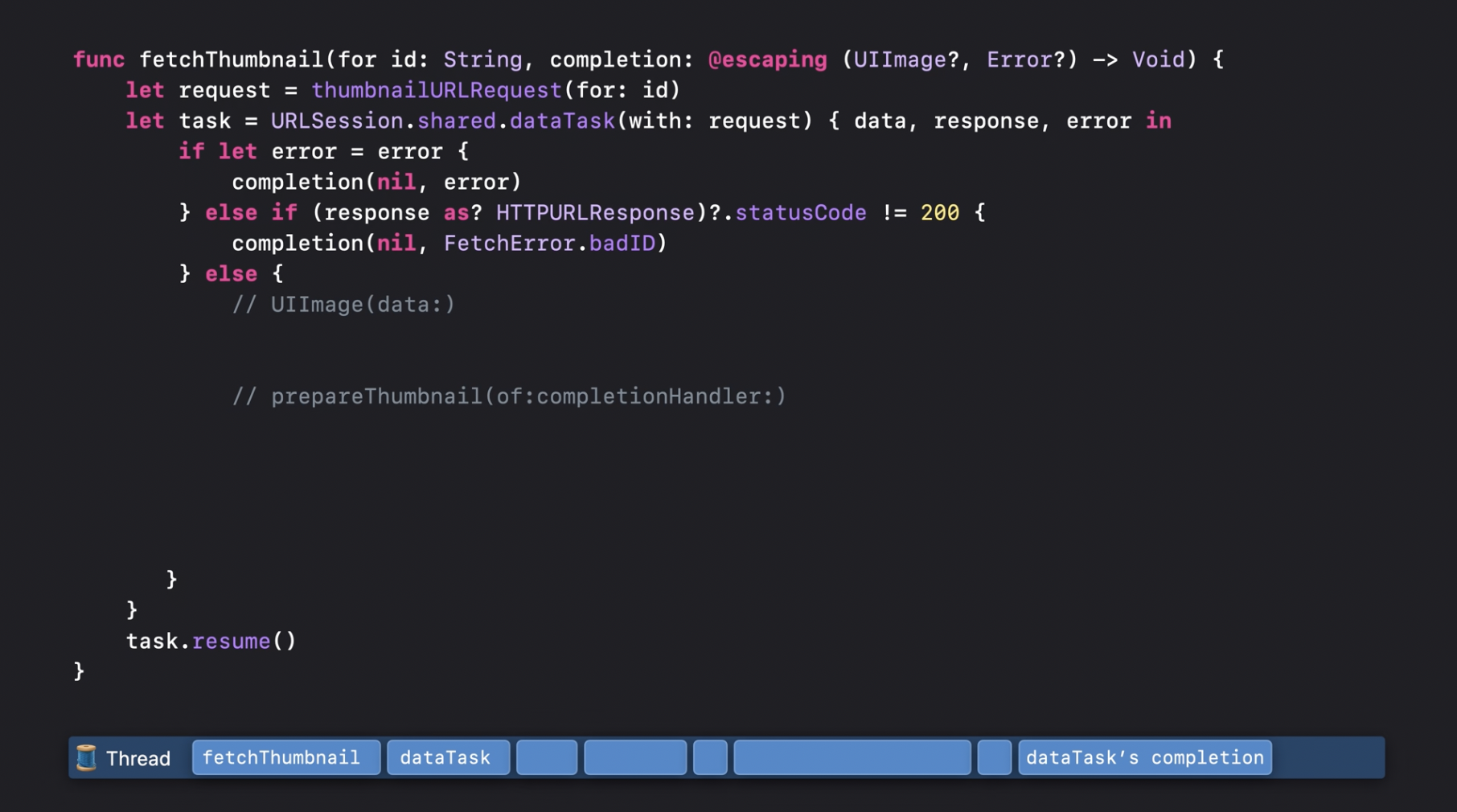 그다음, fetchThumbnail은 다운로드한 데이터를 이용해 UIImage를 생성하려고 시도합니다. 만약 성공하면, 해당 이미지의 thumbnail 속성을 사용하여 썸네일을 렌더링합니다. 이 과정에서 스레드는 블로킹되지 않으며, 썸네일 프로퍼티가 최종적으로 실행을 재개하고 fetchThumbnail 로 값을 반환할 때까지 다른 작업을 수행할 수 있습니다. 썸네일이 정상적으로 렌더링되면, fetchThumbnail은 이를 반환합니다. 그렇지 않다면, 오류를 던지게 됩니다.