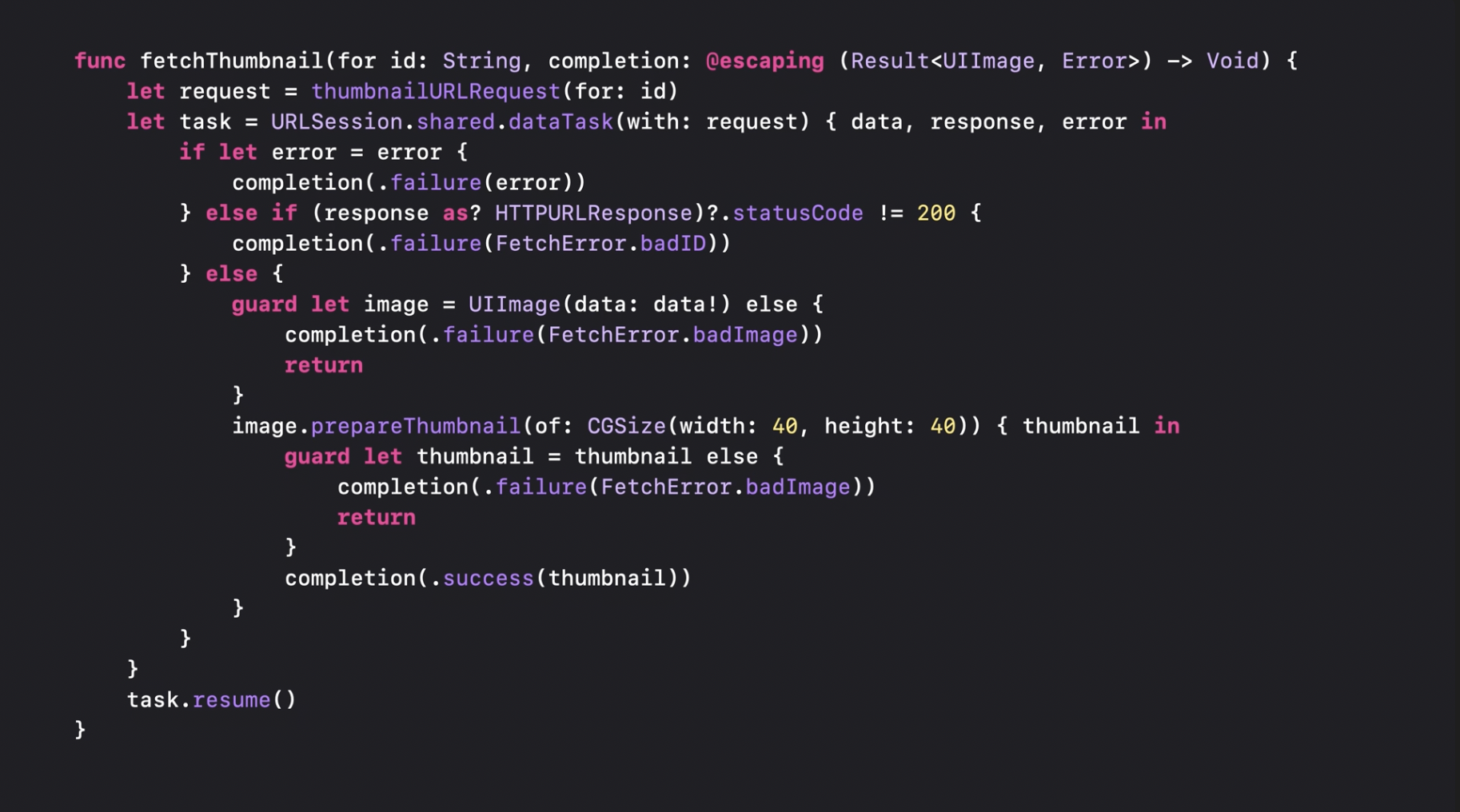 오류 발생 시, 우리는 완료 핸들러를 호출하고 오류를 전달해야 합니다. 만약 모든 과정이 정상적으로 진행되었다면, UIImage의 initWithData를 사용하여 데이터로부터 이미지를 생성합니다. 이 메서드는 동기적으로 동작하므로 결과를 처리하는 코드를 일반적인 순차적 코드로 작성할 수 있습니다. 이미지를 생성하지 못했다면 작업을 종료합니다. 그러나 이미지가 생성되었다면, 마지막으로 UIKit의 prepareThumbnail 메서드를 호출하고 완료 핸들러를 전달합니다. 이 작업이 진행되는 동안, 스레드는 블로킹되지 않으며 다른 작업을 수행할 수 있도록 해제됩니다. 썸네일 준비가 완료되면, 해당 완료 핸들러가 호출됩니다. 썸네일 생성이 성공하면 이미지가 전달되며, 실패하면 nil이 반환됩니다. 만약 성공했다면, 최종적으로 완료 핸들러를 호출해 생성된 이미지를 전달합니다.