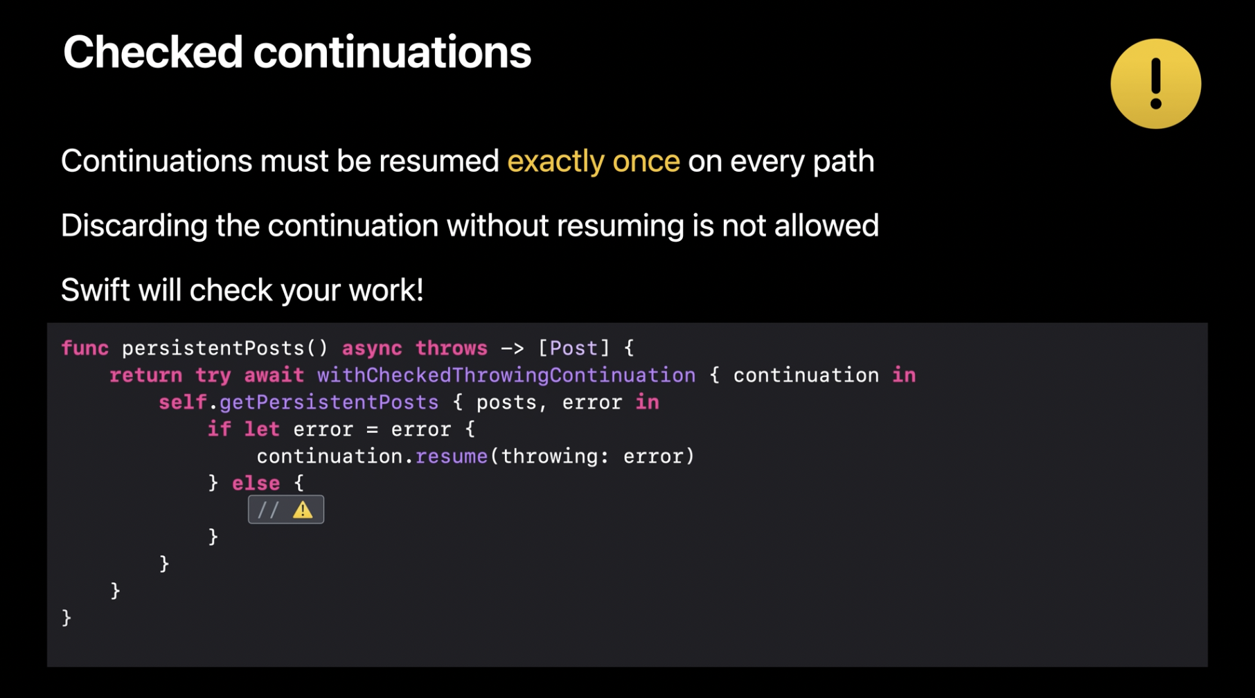컨티뉴에이션은 비동기 함수의 실행을 수동으로 제어할 수 있는 강력한 방법을 제공하지만, 몇 가지 유의해야 할 사항이 있습니다. 컨티뉴에이션은 단순하지만 중요한 계약을 따릅니다. 모든 경로에서 resume이 정확히 한 번 호출되어야 합니다. 하지만 걱정할 필요는 없습니다. Swift가 이를 검사해 줍니다. 만약 컨티뉴에이션이 resume을 호출되지 않은 상태로 종료되면, Swift 런타임은 이를 경고합니다. 왜냐하면 이는 비동기 호출이 계속 중단된 상태로 남아 있게 만들기 때문입니다.