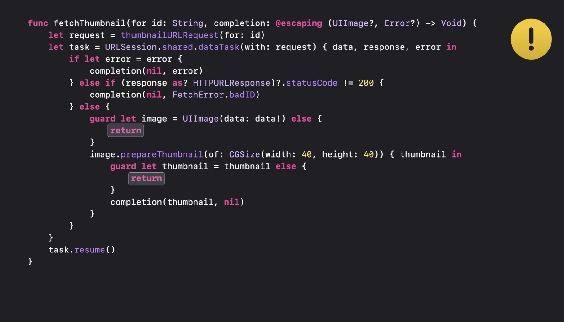 하지만 로버트가 지적했듯이, 여기에는 문제가 있습니다. fetchThumbnail의 호출자는 이 함수의 작업이 끝났을 때(설령 실패하더라도) 반드시 알림을 받아야 합니다. 그런데 현재 코드에서는 호출자가 아무런 응답도 받지 못하는 상황이 발생할 수 있습니다. 저는 "guard else return"을 너무 익숙하게 사용하다 보니, 완료 핸들러를 두 번 호출해야 한다는 사실을 깜빡했습니다. 따라서, 데이터에서 UIImage를 생성하거나 썸네일을 준비하는 과정에서 실패하면, fetchThumbnail을 호출한 쪽에서는 아무런 알림도 받지 못하게 됩니다. 그 결과, 해당 리스트의 행은 업데이트되지 않고, 로딩 스피너(spinner)가 계속 돌아가기만 할 것입니다.
