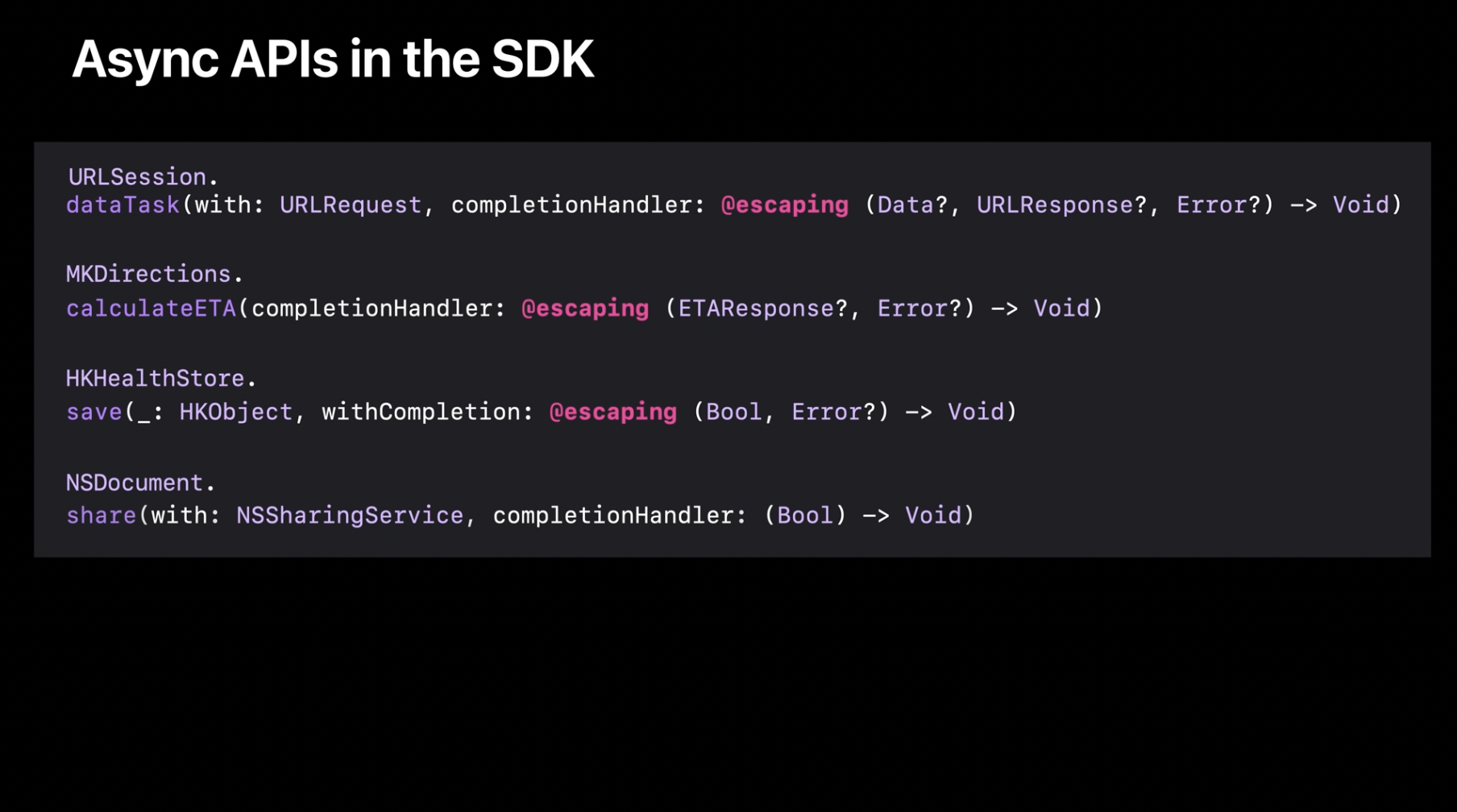 비록 이름과 목적이 다를 수 있지만, 이러한 함수들은 모두 동일한 기본 API 계약을 따릅니다. 즉, 함수를 호출하면 제공된 완료 핸들러로 결과를 전달해 다시 호출자에게 응답하는 방식입니다. 앞서 네이트가 보여준 것처럼, 비동기 함수의 결과를 기다릴 수 있다면 더 자연스럽게 코드를 작성할 수 있습니다. 그렇다면 이러한 콜백 블록을 비동기 함수로 변환할 수 있다면 정말 편리하지 않을까요?