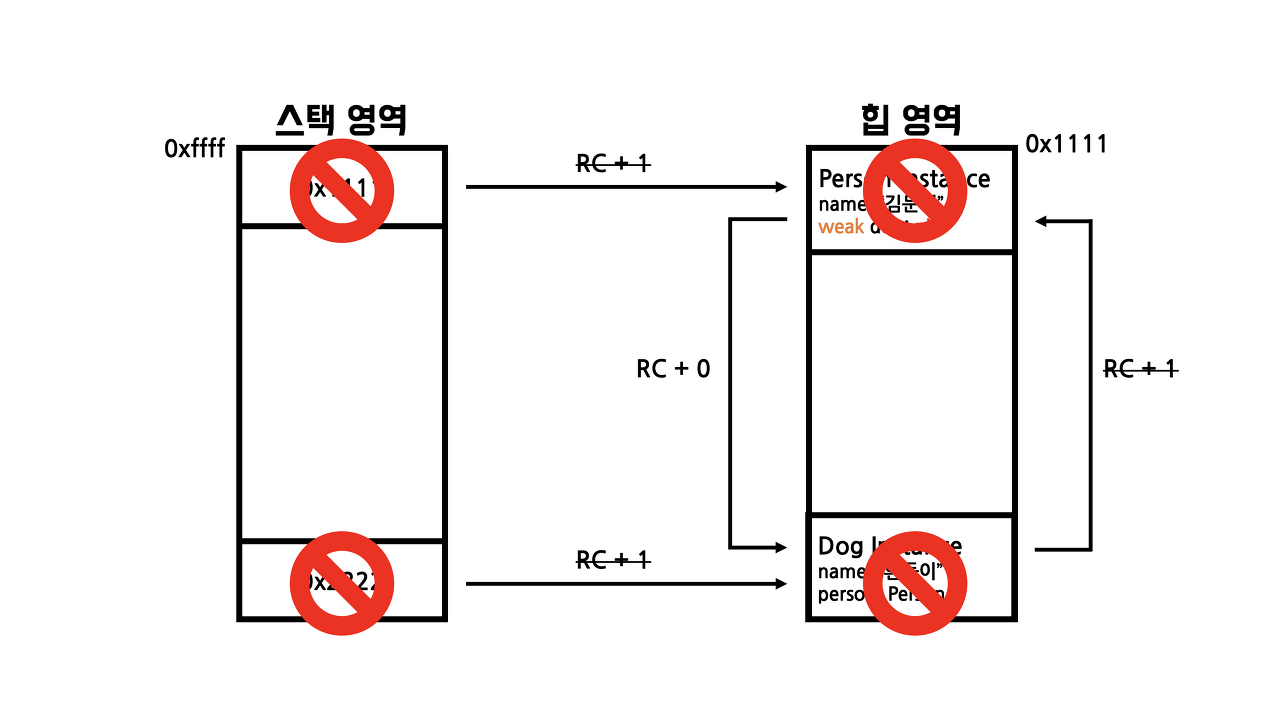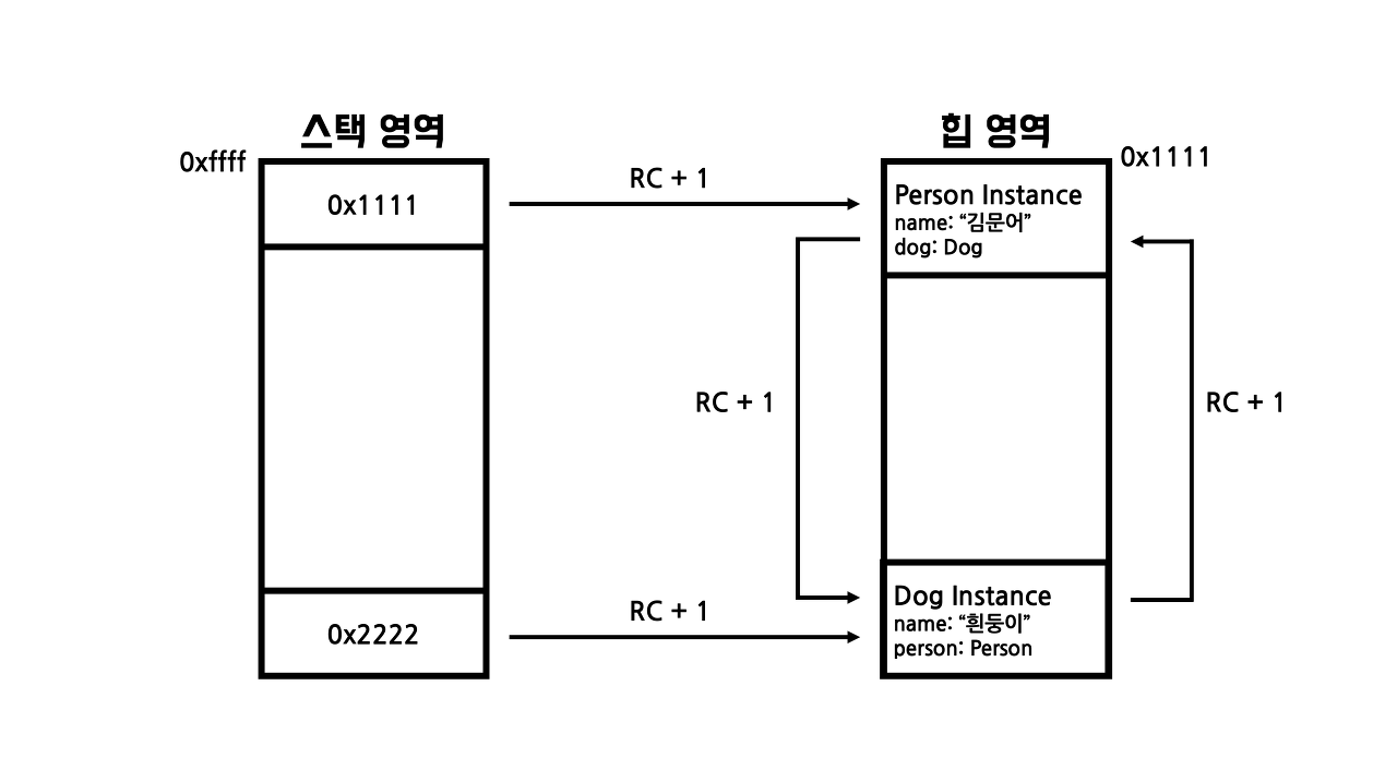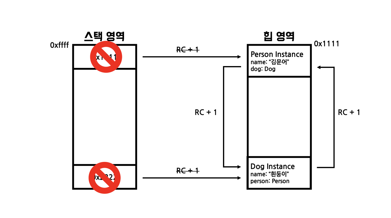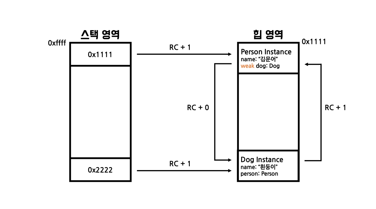 왜 그럴까요? person 프로퍼티와 dog 프로퍼티에 nil을 할당하여 RC를 1 감소시키더라도, 각 인스턴스 내 프로퍼티가 여전히 서로를 가리키고 있어 RC가 (0이 아니라) 1이 되기 때문입니다. 위 예제 코드를 그림으로 그려보면 아래와 같습니다.