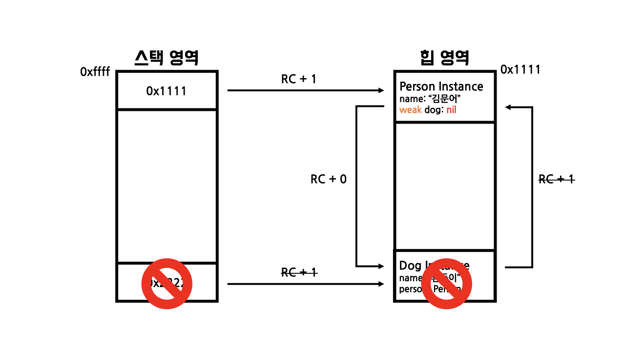 dog 인스턴스가 person 인스턴스보다 먼저 메모리에서 해제될 확률이 높기에 dog 프로퍼티에 weak 키워드를 붙여주었습니다. dog 인스턴스가 메모리에서 해제된다면 dog 프로퍼티는 자동으로 nil이 할당되고, 개발자는 메모리에서 해제된 인서턴스에 접근하는 실수를 막을 수 있습니다.