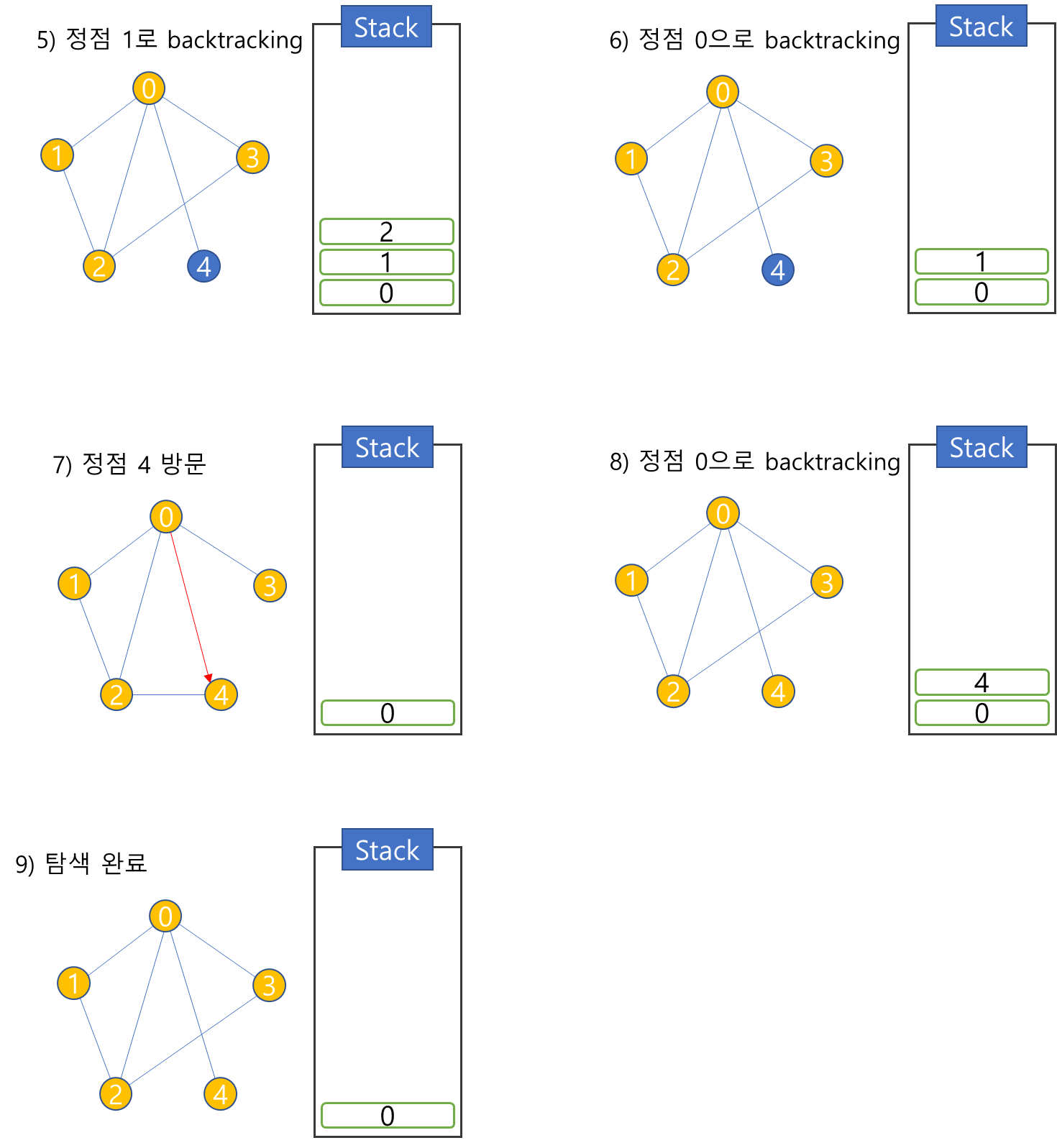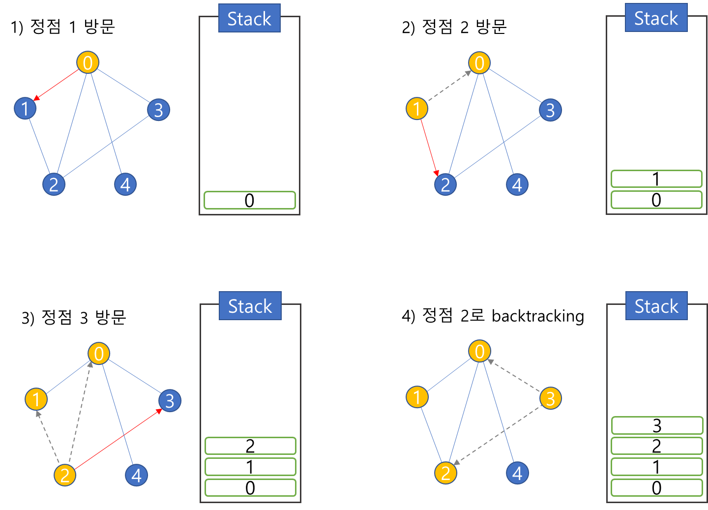 방문한 노드는 스택에 담고, 스택의 top에 있는 노드와 연결된 노드를 탐색한다. 이 때 stack에 이미 담겨있는 노드는 탐색하지 않는다. 더 이상 방문할 노드가 없다면 backtracking 하여 탐색할 다시 탐색할 노드를 찾는다.