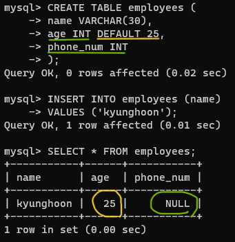 TABLE의 칼럼 age와 phone_num의 유일한 차이는 DEFAULT값을 지정해주었냐 지정해주지 않았냐 차이밖에 없습니다. 그리고 어떤 값도 넣어주지 않았을 때 age는 DEFAULT로 지정된 25가 출력되고 phone_num은 null이 출력됨을 알 수 있습니다.