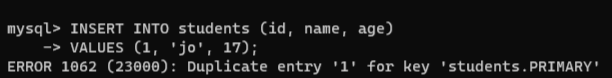 반대로 name과 age값이 다르더라도 기존에 있는 PRIMARY KEY와 겹치면 추가가 불가능 합니다.