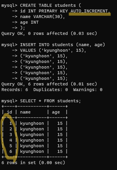 테이블을 생성할 때 AUTO_INCREMENT를 설정하면 PRIMARY KEY를 유저가 따로 입력하지 않더라도 숫자를 하나씩 올리며 id값이 겹치지 않게 해줍니다.