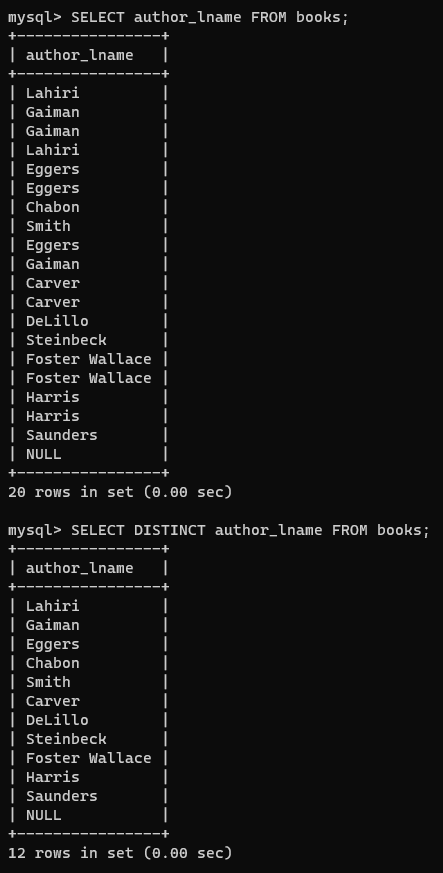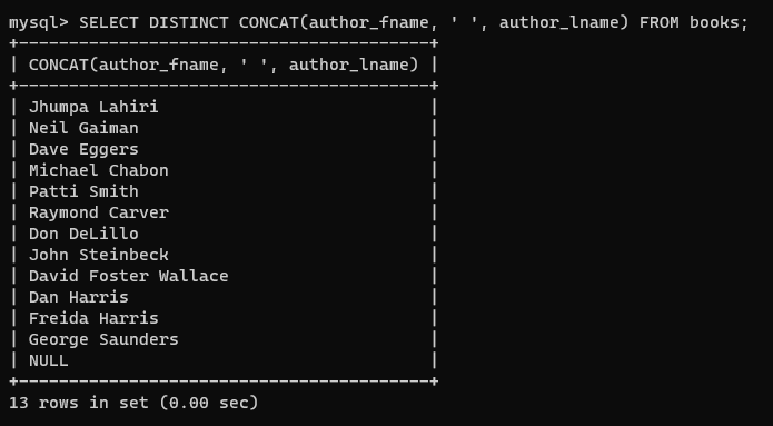 DISTINCT의 조건을 CONCAT과 같은 함수를 통해 더 디테일하게 설정하는 것도 가능합니다. 작가의 풀네임을 기준으로 DISTINCT 함수를 사용한 것 입니다.