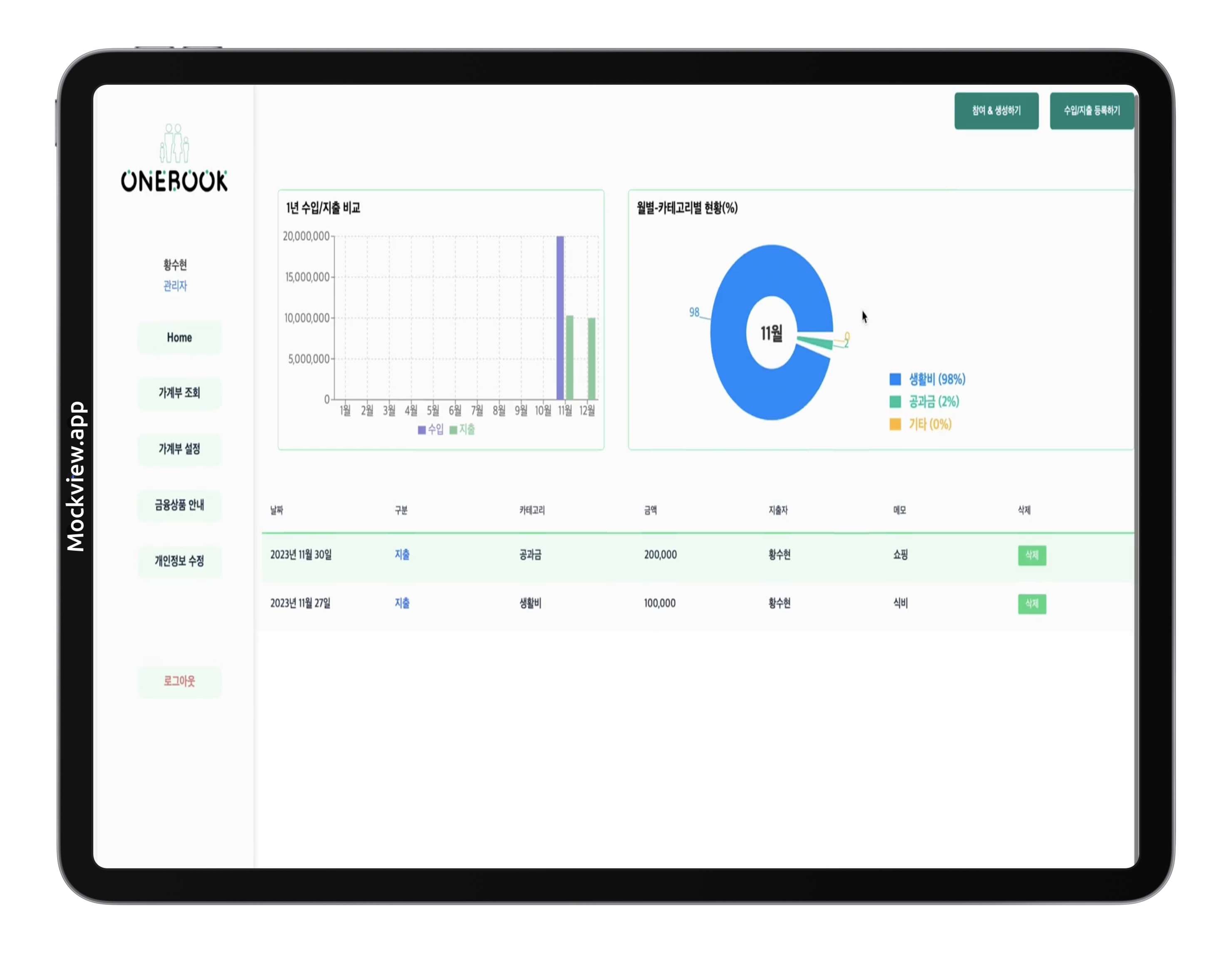 - 메인 페이지 - 대시보드(1년 수입/지출과 월별-카테고리별 현황 그래프)