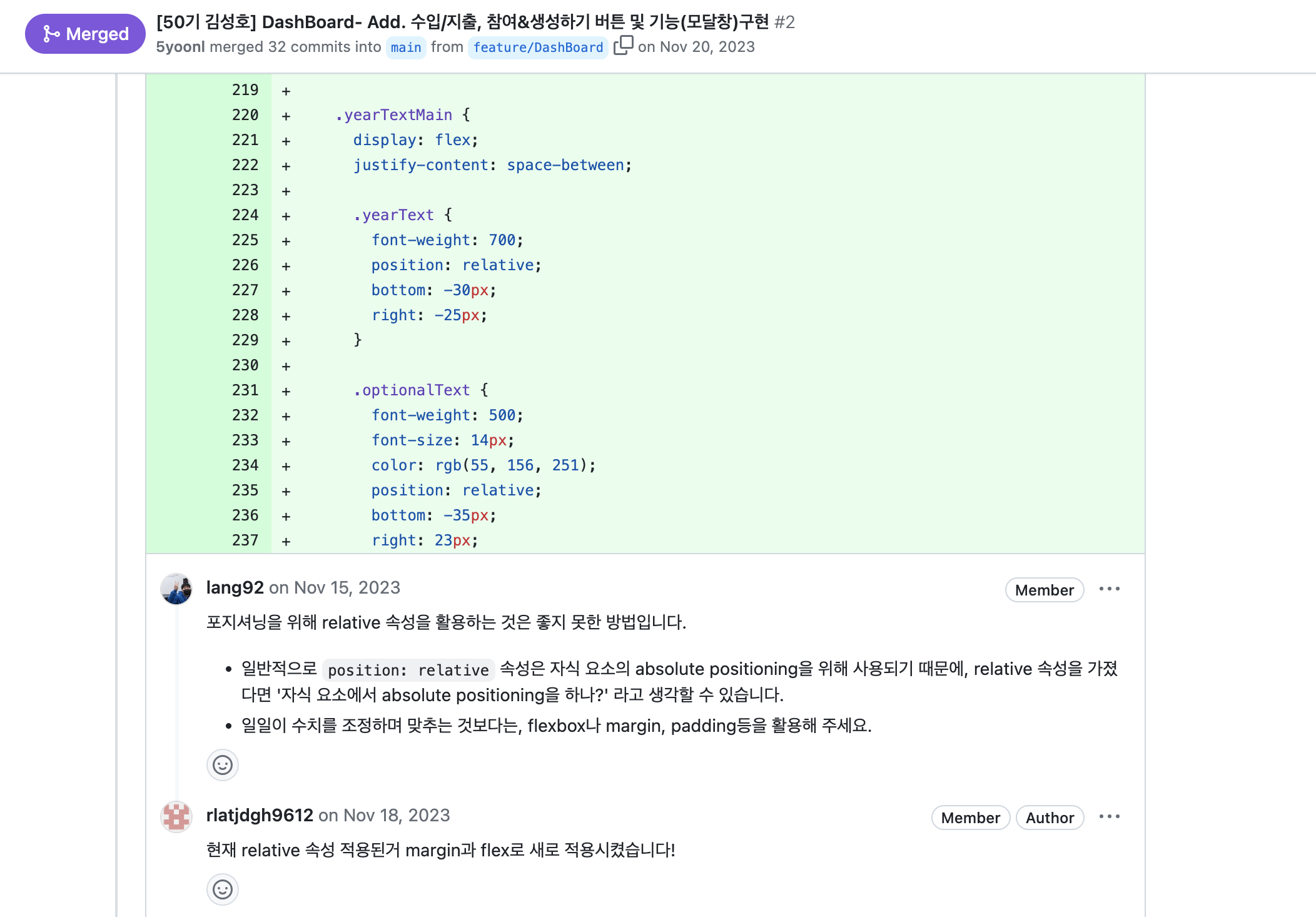 제가 맡았던 기능들은 대시보드, 메뉴바, 막대/원형 그래프 구현을 담당했습니다. 개발 수행시 멘토님의 코드리뷰와 해결해야 할 과제가 많았는데, 특히 막대그래프와 원형차트의 구현이 어려웠지만, 이러한 어려움과 에러를 극복하며 적용하기 위해 노력했습니다. 만약에 저희 팀에서 개발한 가계부 프로젝트가 실제 사용자들에게 배포해서 사용에 대한 피드백을 받는다면, 그것을 어떻게 적용해야 하는지 문제 해결의 의미를 생각하며 스스로 반성해야 겠다고 느꼈습니다.