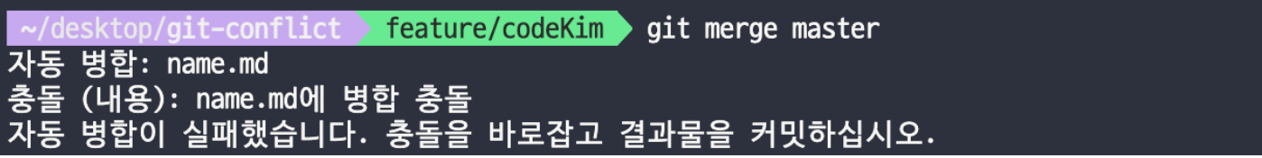 병합하고자 하는 브랜치로 이동후에 main branch와 작업 중인 branch를 병합시켜주면? 아래와 같이 자동 병합 즉, merge 하려는 순간 Conflict가 발생했다는 문구를 작업자에게 표시해준다.