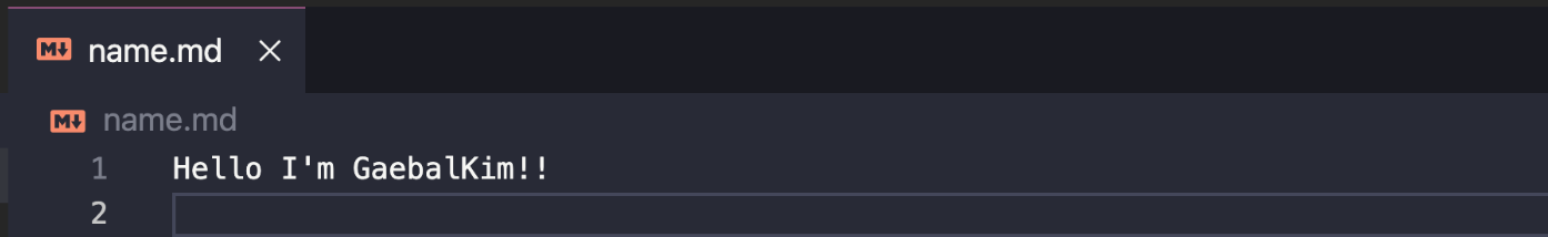 - 먼저 feature/gaebalKim 브랜치에서 name.md 파일에 Hello I’m GaebalKim 이라고 코드를 작성하여 Github에 push 하고 PR을 작성했다.