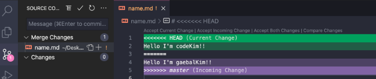 - VS Code의 Source Control 탭을 클릭 후, Merge Changes 안에서 충돌이 발생한 파일을 확인하여 수정을 해줍니다. 충돌이 발생한 name.md파일을 열면, 아래의 기호로 섹션이 구분되어 있기 때문에 어떤 부분에서 충돌이 발생했는지를 확인할 수 있다.