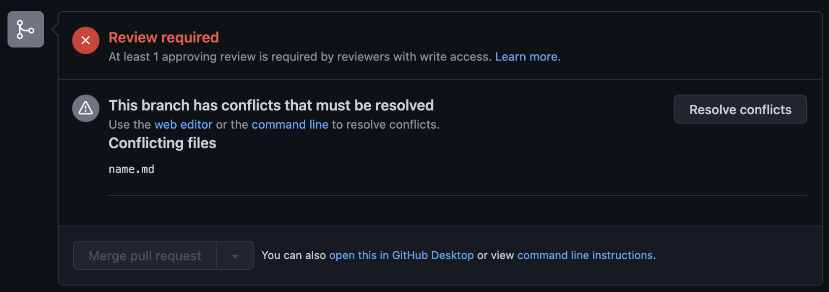 Github 상에서도 김코드 branch에서 아래와 같이 Conflict가 발생해 병합을 할수 없는 상황임을 알 수 있도록 보여주게 된다. (즉, Conflict로 인해 main branch와 병합을 할 수 없다는 뜻으로 이해하면된다.)