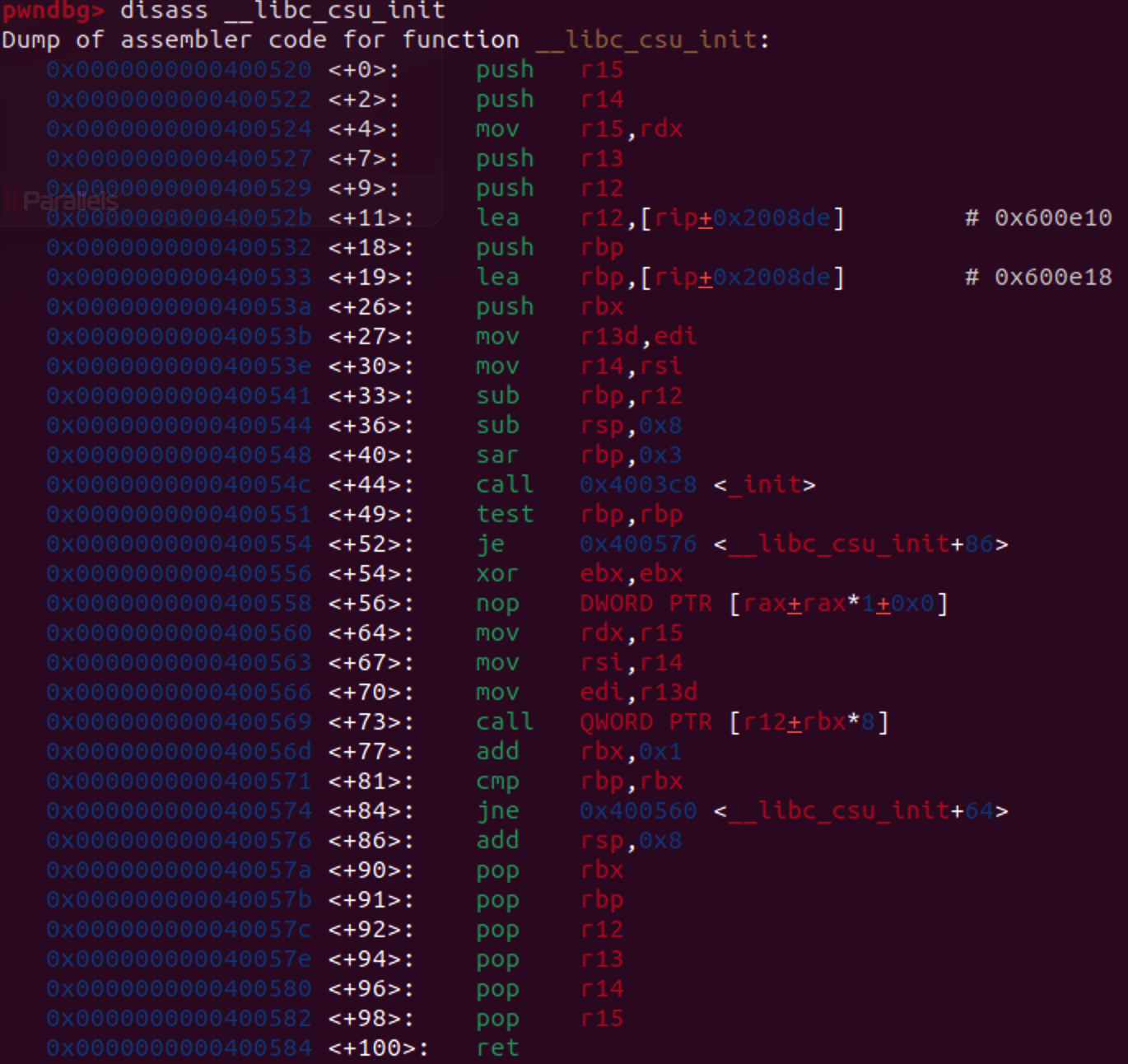 그렇다면 gadget이 부족해서 원하는대로 chain을 하지 못하면 안되기 때문에 다른 함수들 중에서 레지스터 값을 바꿔주는 함수를 찾아서 그 함수를 이용해서 chain을 해야하는 것이다. 그 함수가 바로 __libc_csu_init 함수이다.