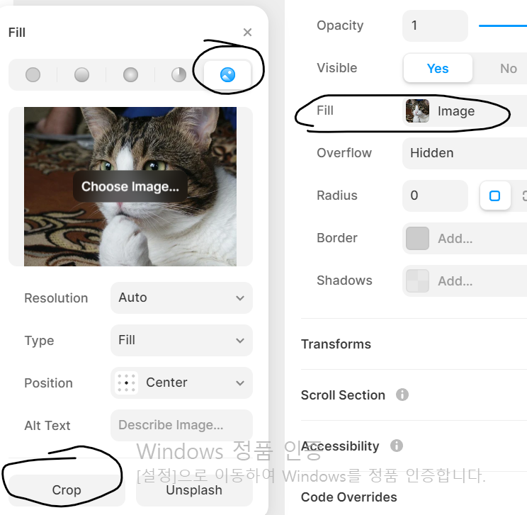 만든 Frame을 클릭하고 오른쪽의 목록에서 style의 Fill을 클릭하면 동그라미 친 부분에서 이미지를 업로드할 수 있다.