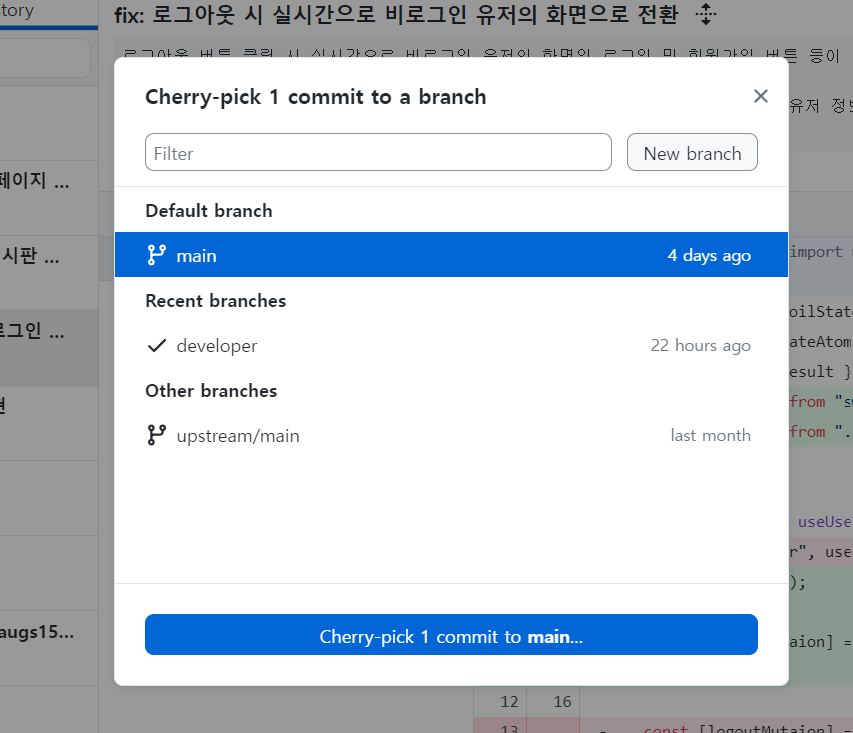 main으로 보낼 것이므로 main 클릭하고 cherry-pick 버튼 클릭