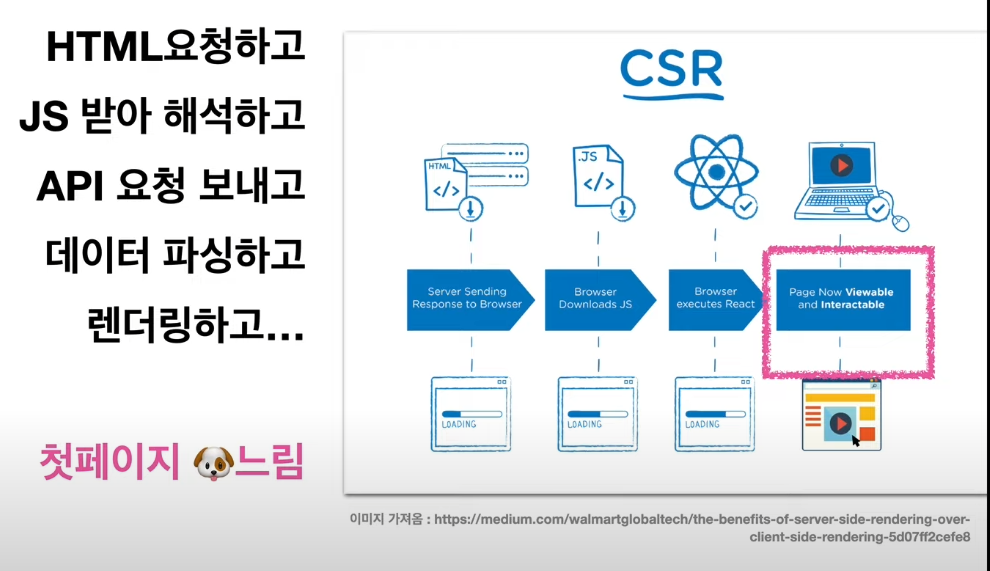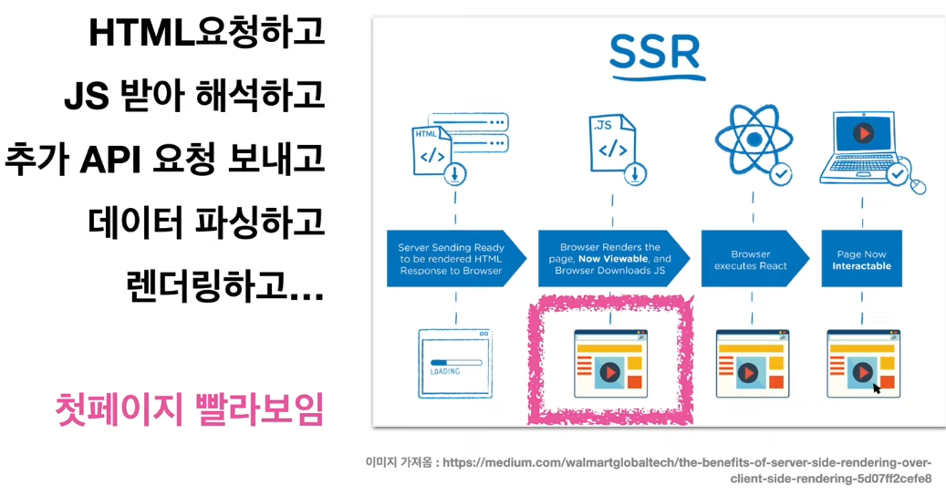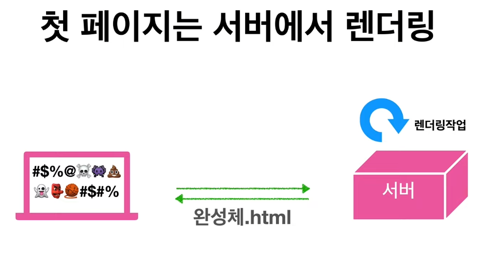 CSR의 방식이다. 여기서 분홍색 네모박스의 과정까지 가도 첫페이지가 아직 렌더링되지 않는다.