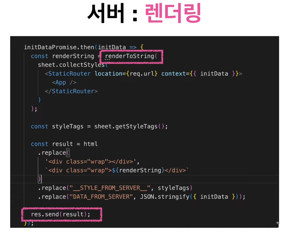 리액트도 이처럼 rederToString() 같은 함수들로 서버에서 리액트 코드로 html을 만드는 방법들을 제공한다.