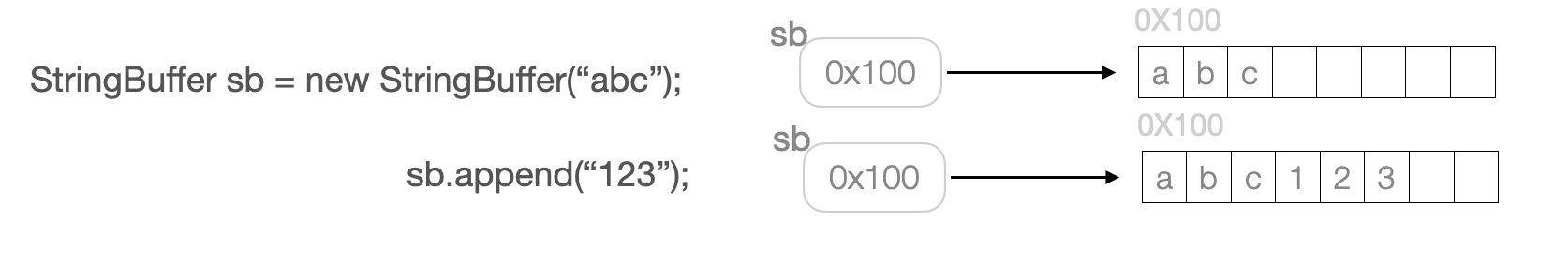 String 클래스가 인스턴스 생성 시 지정된 문자열을 변경할 수 없는것에 반해 StringBuffer 클래스는 변경이 가능하다.