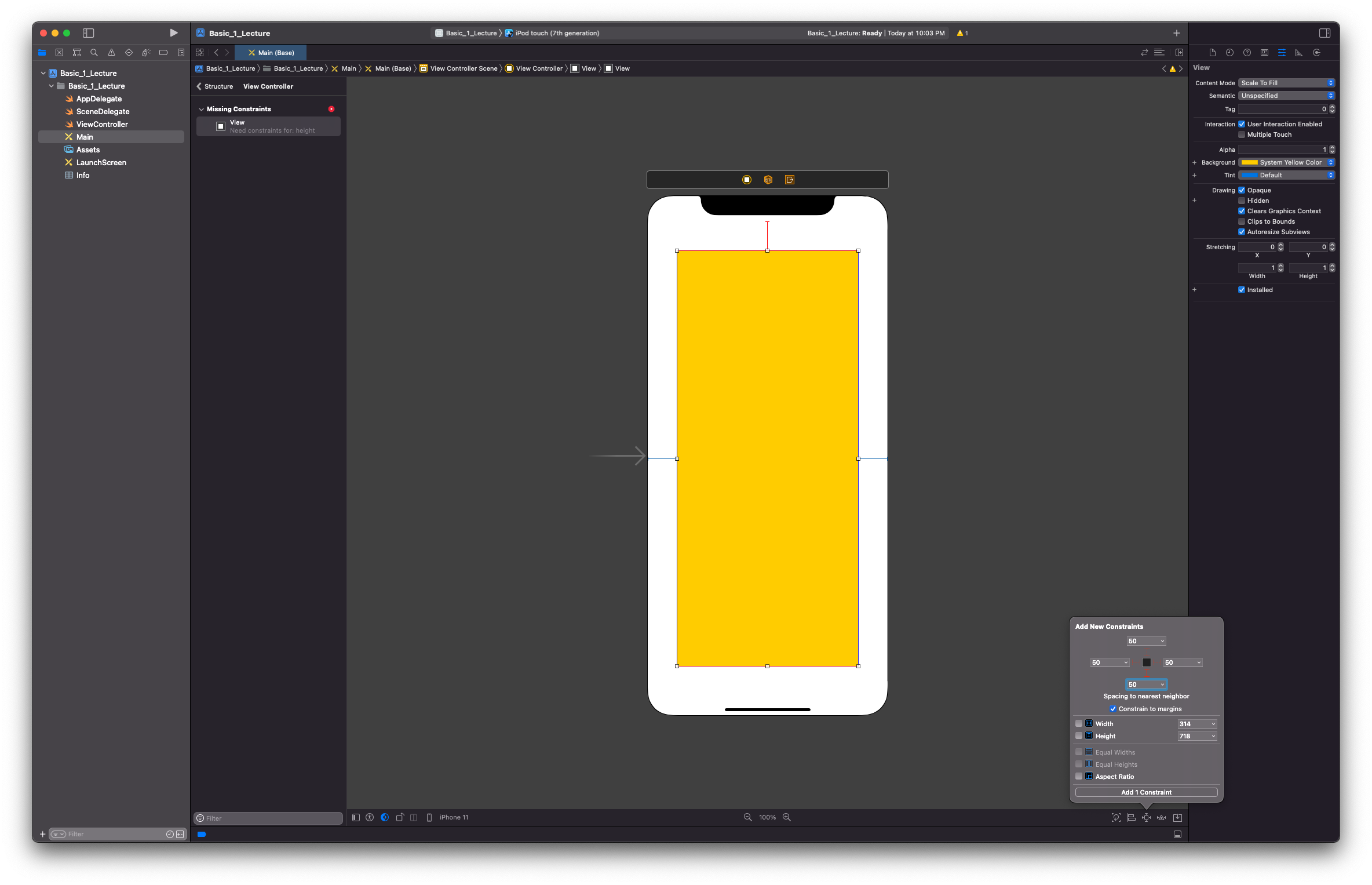 오류선이 잘 보이도록 UIView의 색을 노란색으로 바꾸고 bottom의 Constraints를 삭제해보자.
