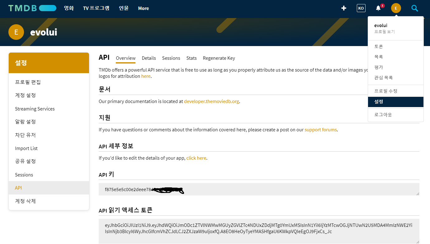 이제 프로필 -> 설정 -> API로 가서 API 키를 복사해서 사용한다.