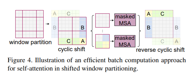 위의 SW-MSA기법을 적용하면서 원래 2×2 개의 윈도우가 3×3 윈도우로 늘어난다면 계산량이 2.25배 증가하는 등 비효율적일 수 있다. 이러한 문제를 해결하기 위해서 Batch크기에 따라서 을 묶어주고 사이클릭 시프트 후 하나의 배치 윈도우는 원래 인접해있던 영역이 아닌 여러 개의 작은 서브 윈도우로 구성될 수 있다.