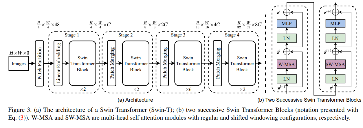 Swin Transformer의 전반적인 구조는 위와 같다. 왼쪽의 그림과 같이 4개의 스테이지를 거치게 된다. 그러면서 각 스테이지마다 Patch Merging을 거치면서 이미지의 공간 차원을 줄이게 된다. 이러한 과정을 거치면서 이미지의 전역적인 부분을 학습할 수 있게 되면서 더욱 다양한 정보를 학습할 수 있게 만들어준다.