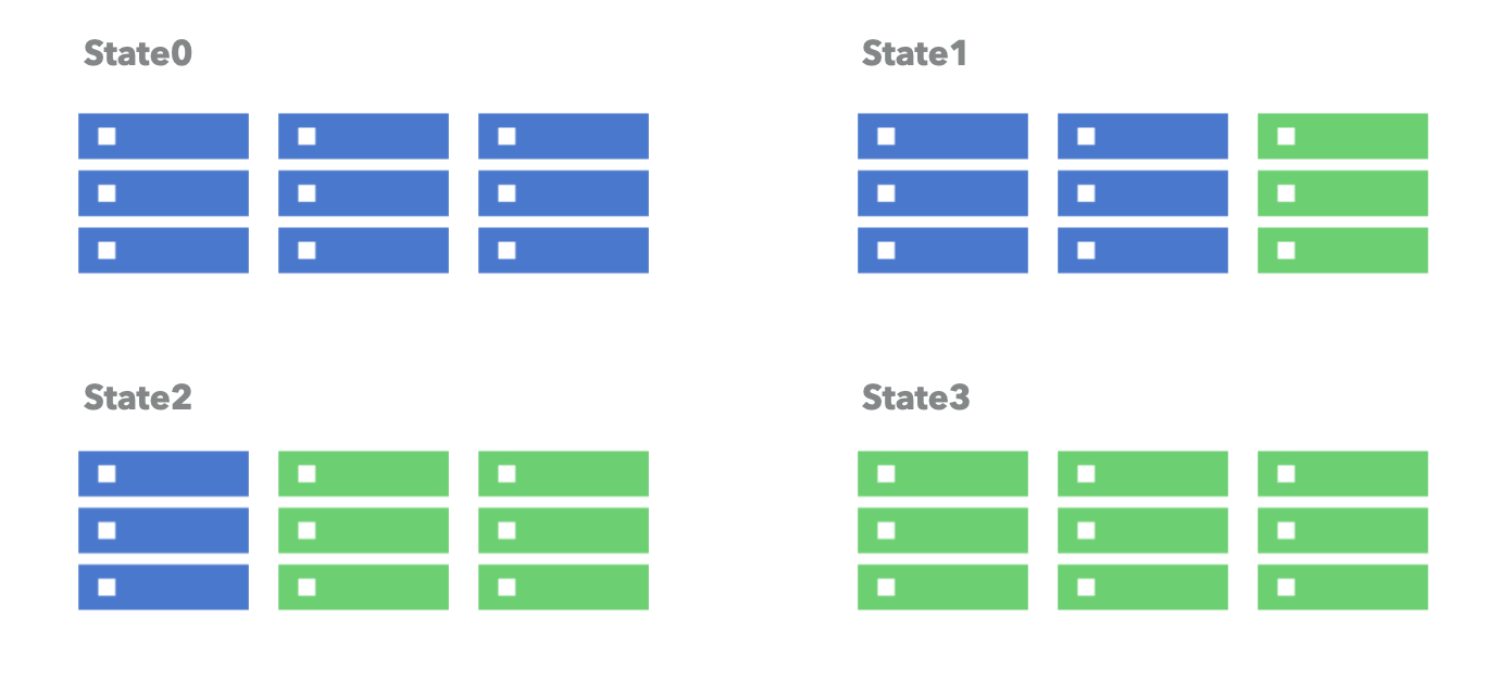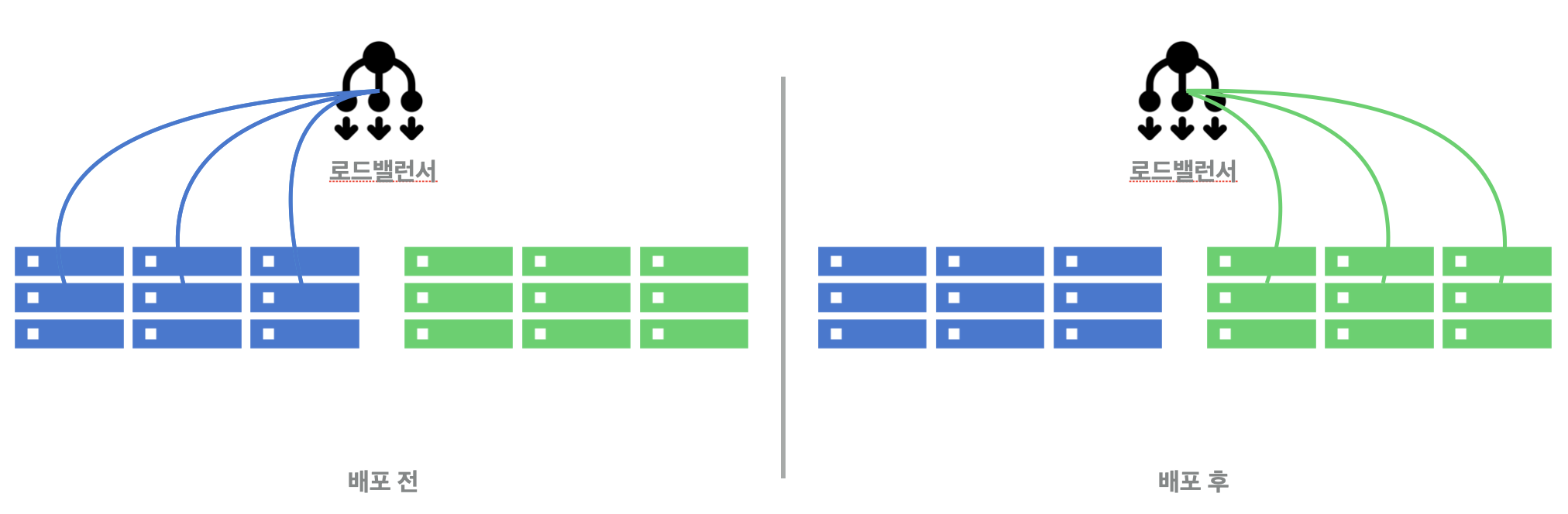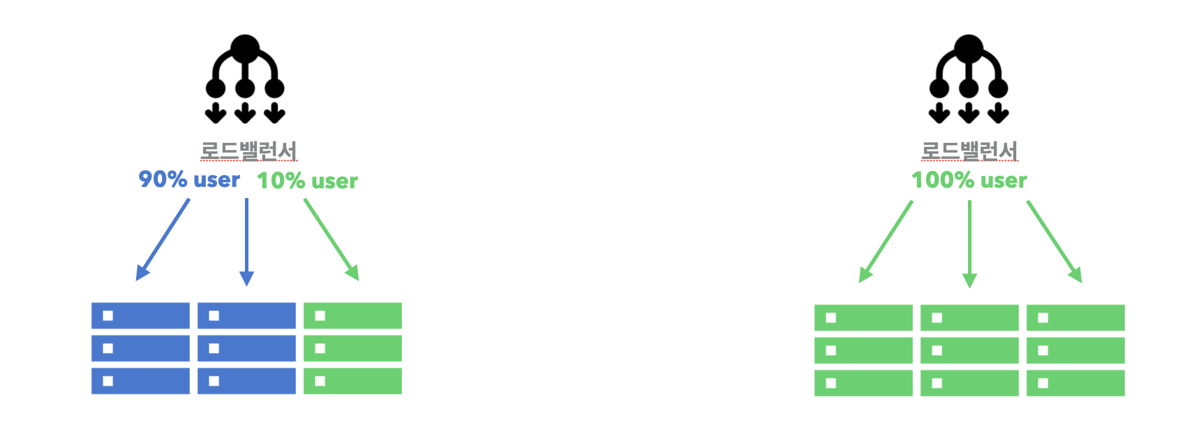 - 실제로 서비스 중인 환경(구버전) blue와 새롭게 배포할 환경(신버전) green을 세트로 준비해서 배포하는 방식