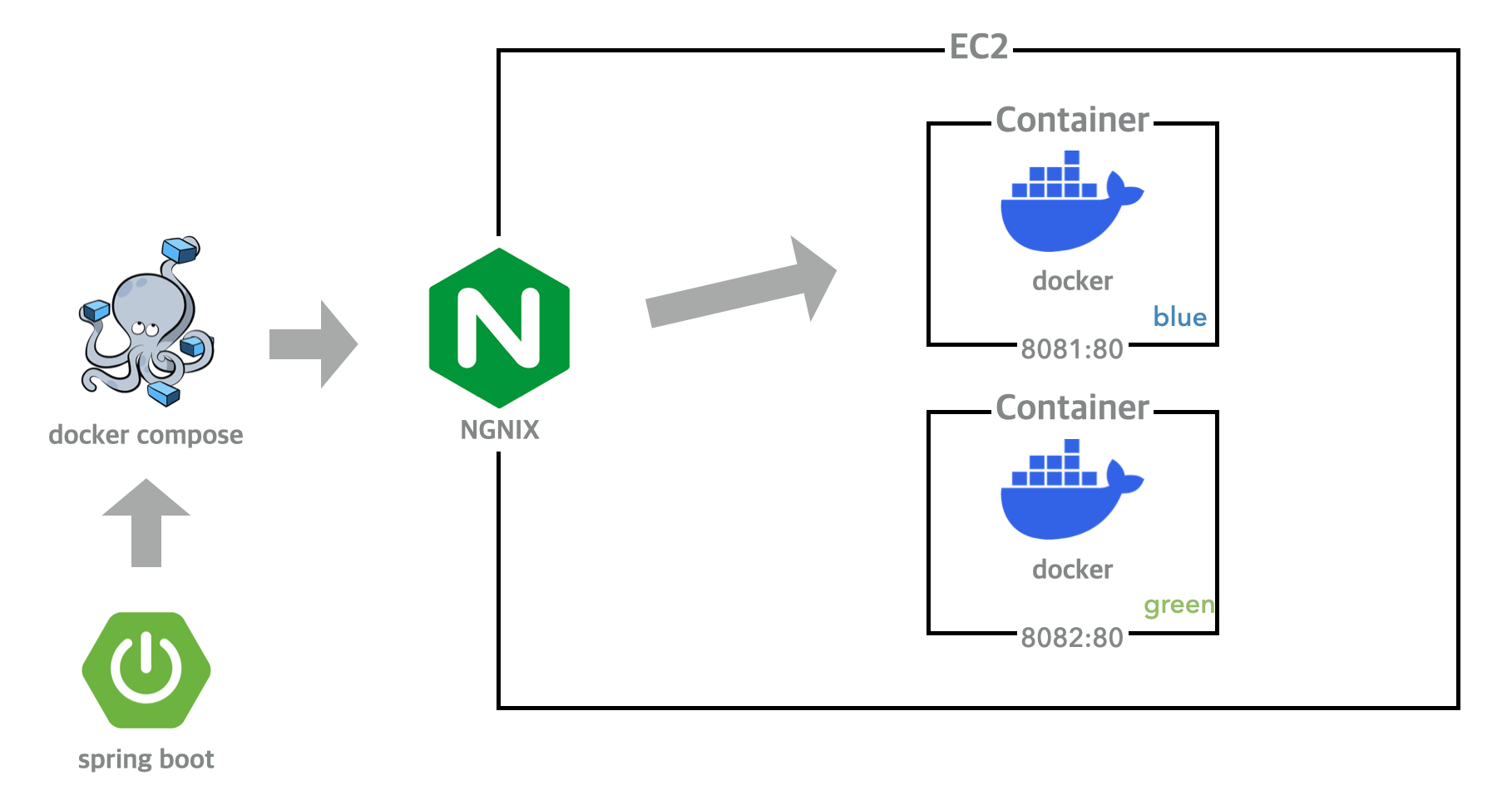 나는 최종적으로는 blue/green을 적용하여 위의 그림처럼 내 ec2에 2개의 컨테이너를 띄워서 (사실 서버를 2개를 띄우는 것이 더 좋지만 그러면 돈이 두배로 드니깐....ㅎㅎ) 한 인스턴스를 2개의 포트로 나눠 구번전과 신버전 서버를 띄우는 방식으로 하려고 한다.
