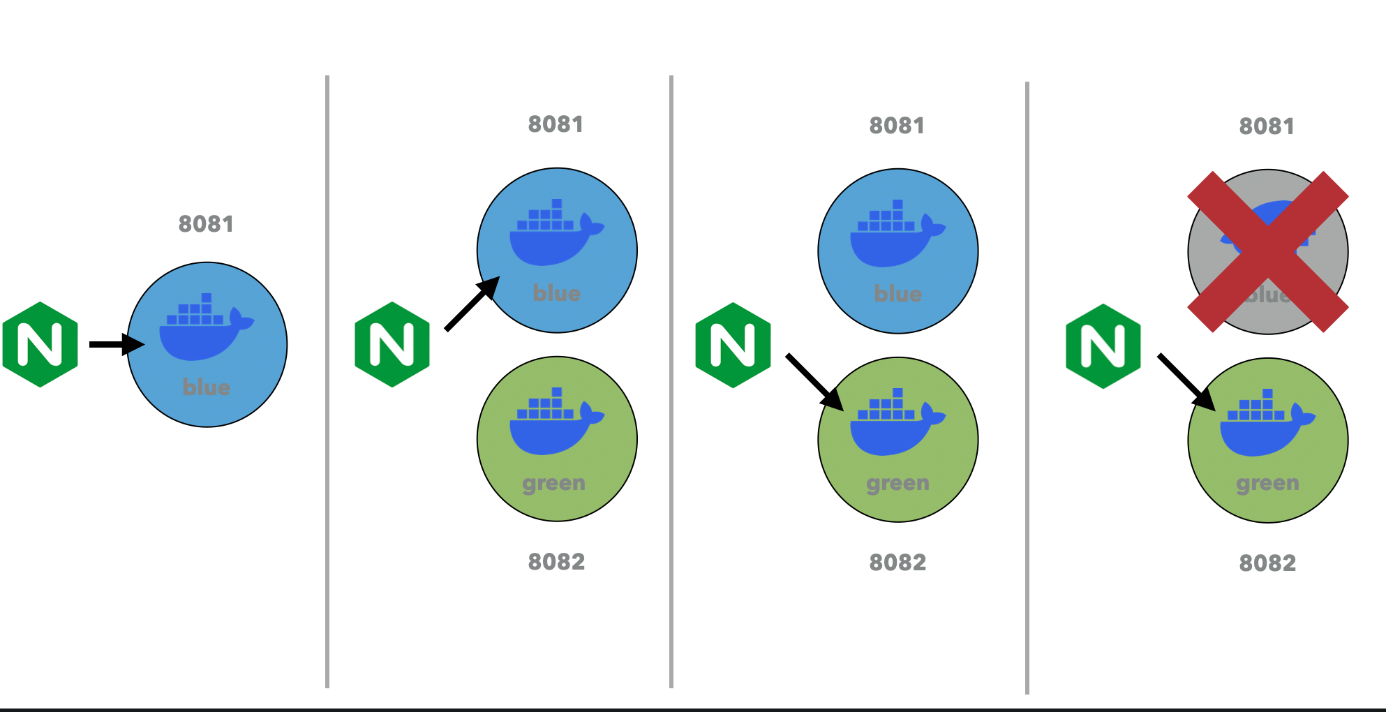 사실 개념은 매우 간단하다. 현재 서버에서 띄워져 있는 버전이 blue인지 green인지 확인을 한다. 만약 블루가 살아있다면 나는 그린 이미지를 가져와 서버에 띄운다. 그럼 이제 nginx가 그린으로 요청을 보내게 설정을 하고 이전 버전인 블루를 죽이면 우리의 서버는 다운타임이 없이 배포가 가능해진다.
