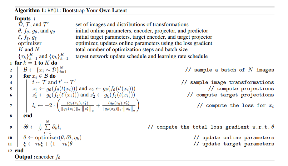 손실 를 symmetrize하기 위해 를 online network에 , 를 target network에 feeding하여 를 계산한다. 각 학습 단계에서, 를 최소화하기 위해 stochastic optimization을 수행한다. 이는 에 대해서만 수행되며, 는 적용되지 않는다. 학습이 끝나면, encoder 만 유지된다.