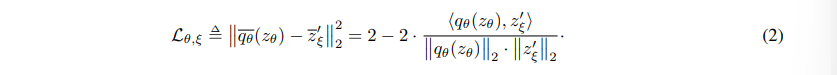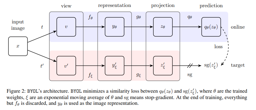 주어진 이미지 세트 에서, 랜덤 샘플링된 이미지 와 두 개의 이미지 증강 분포 와 를 사용해 와 라는 두 개의 증강된 뷰를 생성한다. 첫 번째 증강된 뷰 로부터 online network는 representation 와 projection 를 출력한다. target network는 두 번째 증강된 뷰 로부터 와 를 출력한다. 그런 다음 라는 의 예측 값을 출력하고, 와 를 모두 정규화한다. predictor는 online network에만 적용되므로, online과 target 파이프라인 사이의 구조가 asymmetric하다. 마지막으로 정규화된 예측값과 target projection 사이의 mean squared error를 다음과 같이 정의한다: