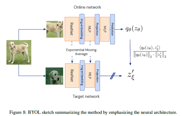 BYOL은 online 및 target netwokr라고 하는 두 개의 신경망을 사용하여 서로 상호 작용하고 학습한다. 이미지의 확장된 view에서 시작하여 BYOL은 online network를 훈련시켜 동일 이미지에서 다르게 augmented된 view의 target network representaiton을 예측하도록 한다.