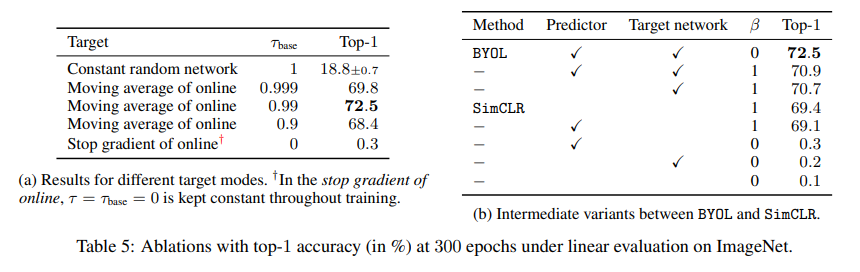 BYOL은 prediction을 위한 target으로 online network의 가중치의 exponential moving average를 사용하여 target network의 projection representation을 사용한다. 이 방식으로 target network의 가중치는 online network의 가중치보다 delay되고 더 stable하다. Target decay rate이 1일 경우, target network는 업데이트되지 않고 초기화에 해당하는 일정한 값으로 유지된다. Target decay rate이 0일 경우, target network는 각 단계에서 online network로 즉시 업데이트된다. Target을 너무 자주 업데이트하는 것과 너무 느리게 업데이트하는 것 사이에는 trade-off가 있으며, 이는 Table 5(a)에서 알 수 있다. Target network를 즉시 업데이트하는 것(τ = 0)은 훈련을 불안정하게 하여 매우 나쁜 성능을 보여주고, target를 전혀 업데이트하지 않는 것(τ = 1)은 훈련을 안정적으로 하지만 반복적인 개선을 방해하며, 결국 저품질의 최종 representation을 얻게 된다. Target decay rate이 0.9와 0.999 사이의 값일 경우 300 에폭에서 68.4% 이상의 top-1 accuracy를 보여준다.