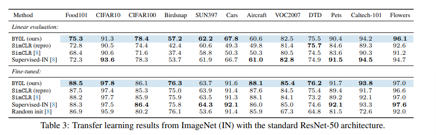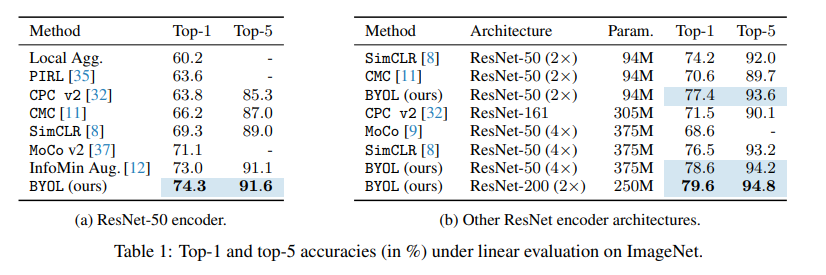 BYOL의 representation의 성능은 ImageNet ILSVRC-2012 dataset의 train set에서 self-supervised pretraining 후 평가하였다.