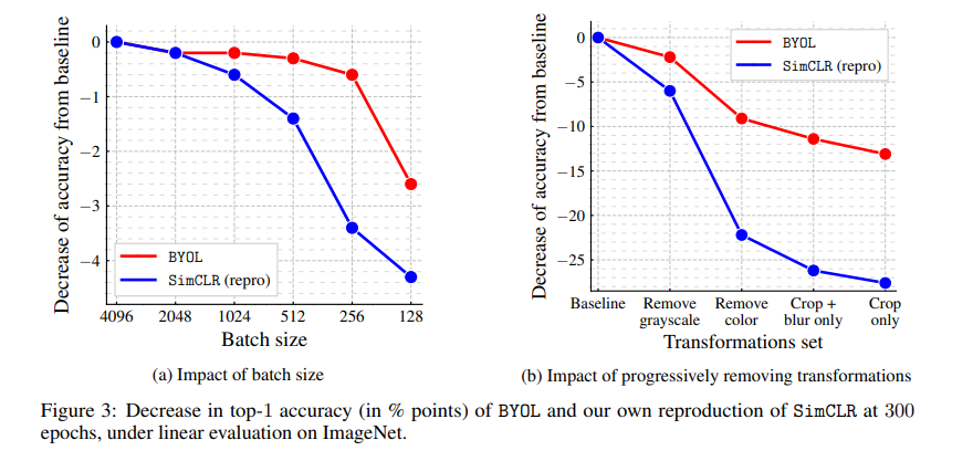 Contrastive method 중 미니배치에서 negative sample을 추출하는 방법은 그 배치 크기가 줄어들면 성능이 떨어진다. BYOL은 negative sample을 사용하지 않기 때문에 더 작은 배치 크기에 대해 더 robust할 것으로 예상된다. 저자들은 이 가설을 검증하기 위해, BYOL과 SimCLR을 128에서 4096까지 다양한 배치 크기로 훈련하였다. Fugure 3(a)에서 알 수 있듯이, SimCLR의 성능은 배치 크기가 줄어들면서 빠르게 악화된다. 이는 아마도 negative sample의 수가 감소하기 때문일 것이다. 반면에, BYOL의 성능은 256부터 4096까지 다양한 배치 크기에서 안정적으로 유지된다.