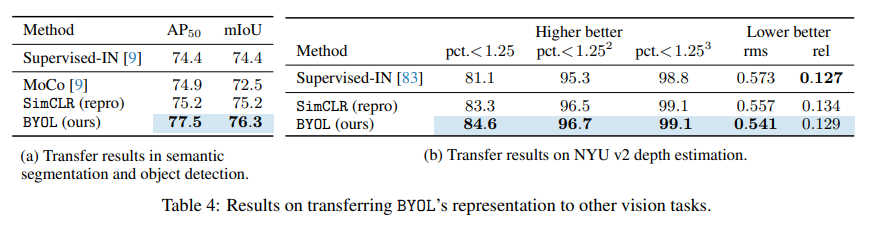 BYOL의 representaiton이 classification task 이외에도 일반화되는지 평가하기 위해, semantic segmentation, object detection, depth estimation과 같은 task에 대해서도 평가하였다. BYOL은 Supervised-IN 기준과 SimCLR 모두를 뛰어넘었다.