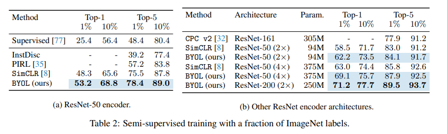 ImageNet train set의 작은 subset에서 label 정보를 사용하여 classification task에 fine-tuning하여 성능을 평가하였다. BYOL은 다양한 아키텍처에 걸쳐 이전 방법들보다 좋은 성능을 보여주었다. 또한, ImageNet 라벨의 100%를 fine-tuning할 때 ResNet-50을 사용하여 BYOL은 77.7%의 top-1 accuracy에 도달하였다.