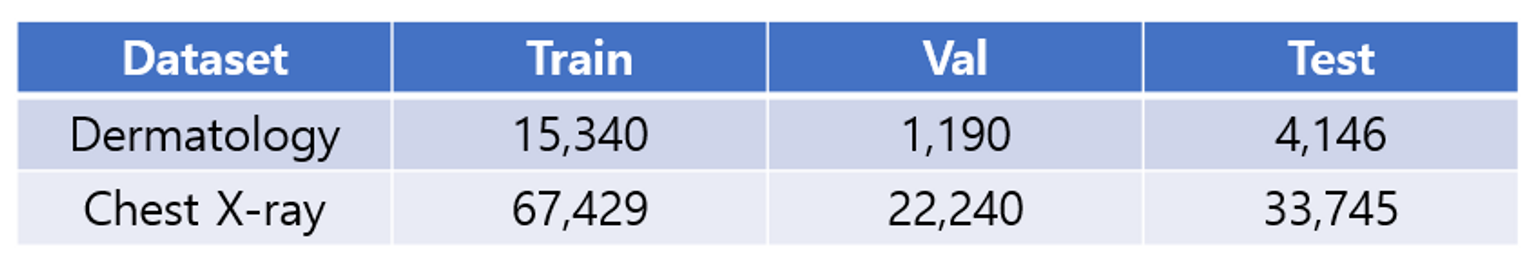 본 연구에서는 Dermatology dataset과 Chest X-ray dataset을 이용하며 데이터를 위의 표와 같이 나누어 학습 및 실험을 진행한다.