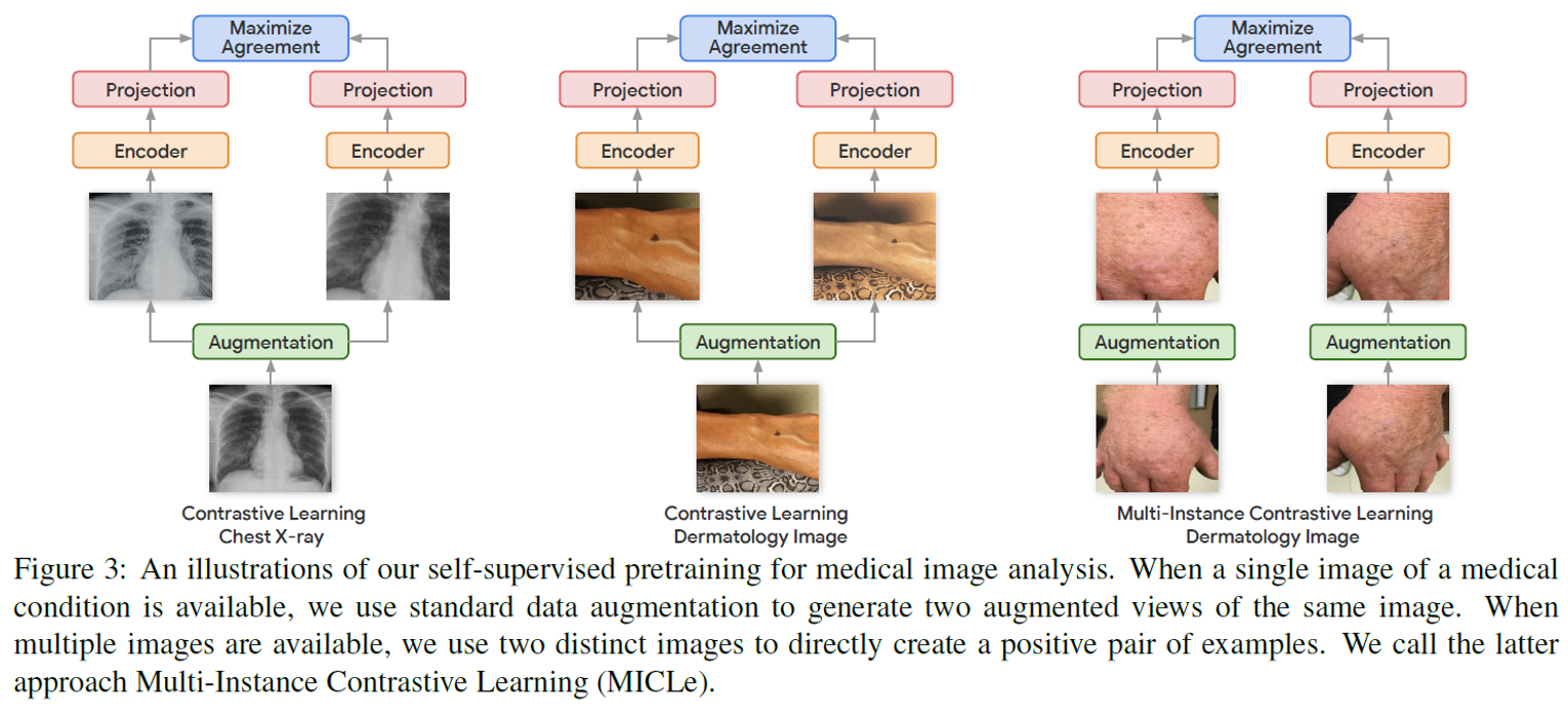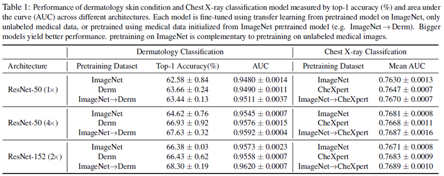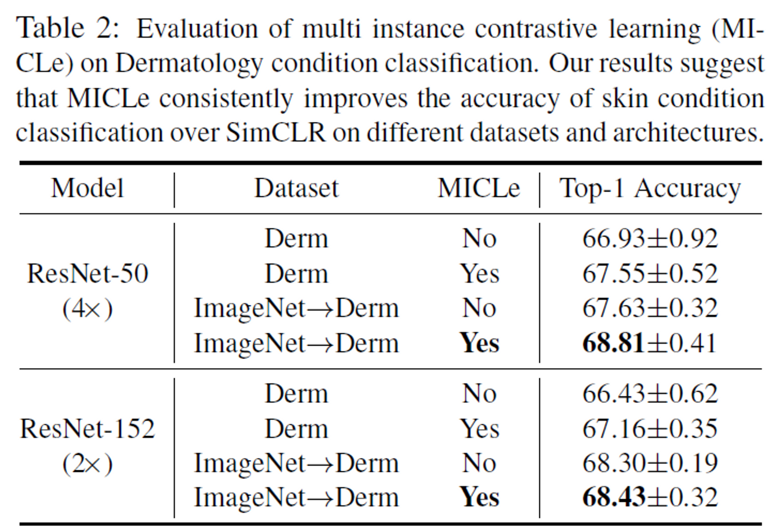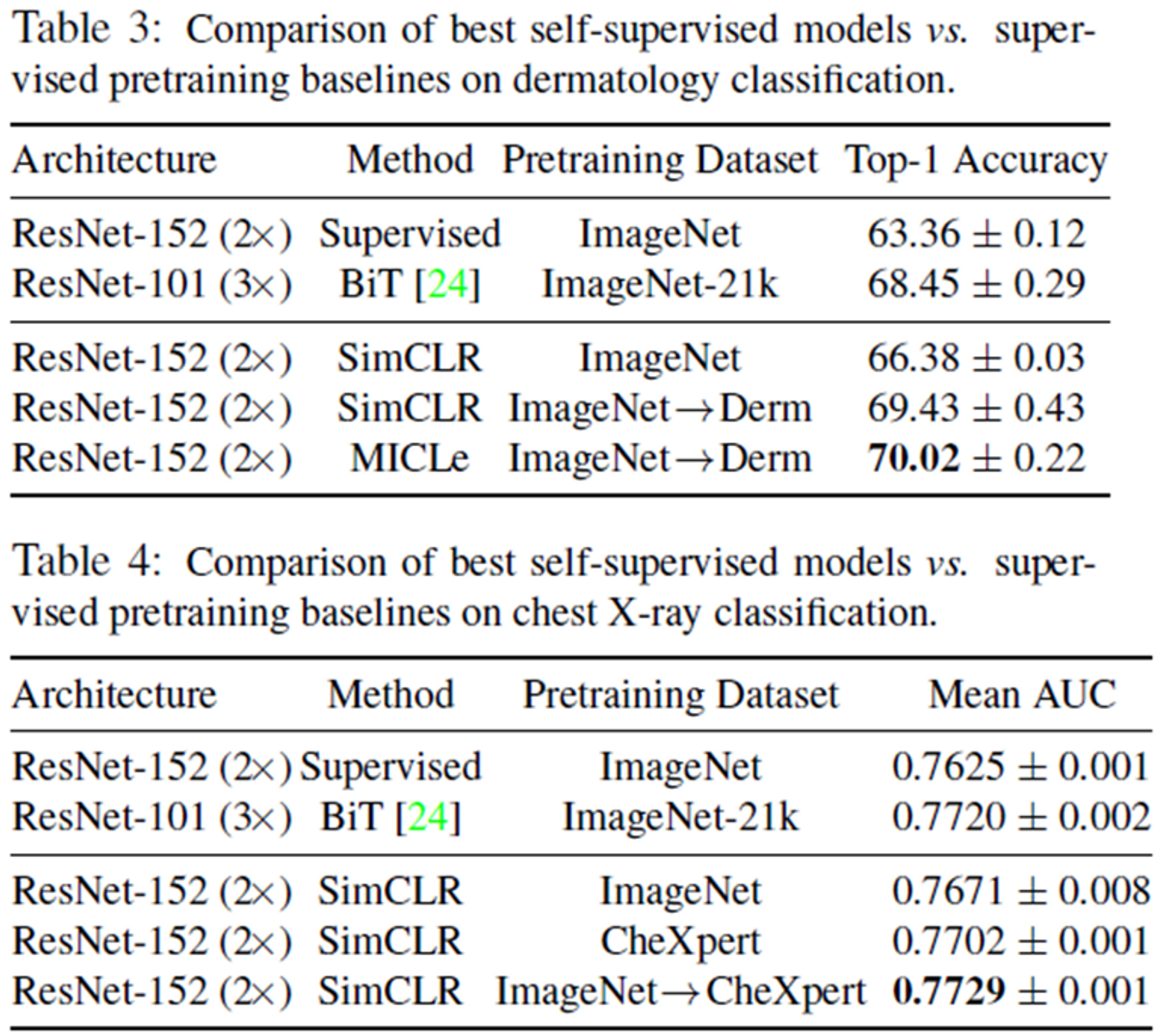 본 논문은 target domain과 다른 domain의 데이터셋이라도 사이즈가 큰 데이터셋은 모델의 성능 향상에 도움을 주는 것을 확인하였으며, pretraining을 진행할 때는, supervised learning보다 self-supervised learning으로 학습한 모델이 더 generalization이 잘되는 것을 확인할 수 있었다. 또한 의료데이터셋과 같은 특성의 데이터셋은 multi-instance가 존재하기 때문에 이에 대한 정보를 이용할 때 더 좋은 성능의 모델로 학습을 진행할 수 있다는 것을 실험적으로 증명했으며 그에 대한 loss인 MICLe을 본 논문은 제시한다.