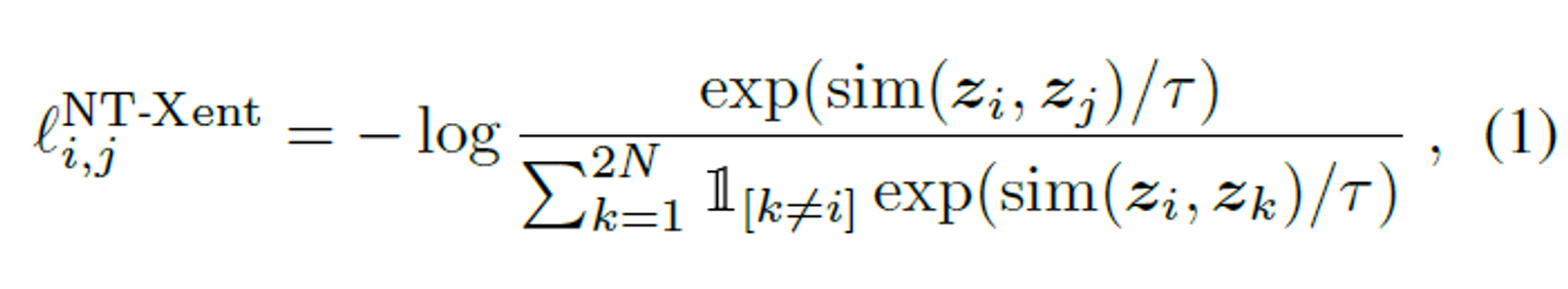 는 동일한 이미지에 transformation을 적용하여 얻은 2개의 이미지에 대한 index를 의미하며 positive sample의 index를 의미한다고 할 수 있다. 는 입력 이미지를 인코딩하여 얻게되는 latent vector 혹은 임베딩 벡터이며, 는 temperature parameter이다. 또한 은 cosine similarity를 의미한다. 위 loss를 이용해서 positive sample은 서로 다른 transformation을 적용하여도 가까운 위치의 vector로 임베딩하게되고 negative sample들은 서로 다른 위치로 멀리 떨어지도록 학습이 된다.