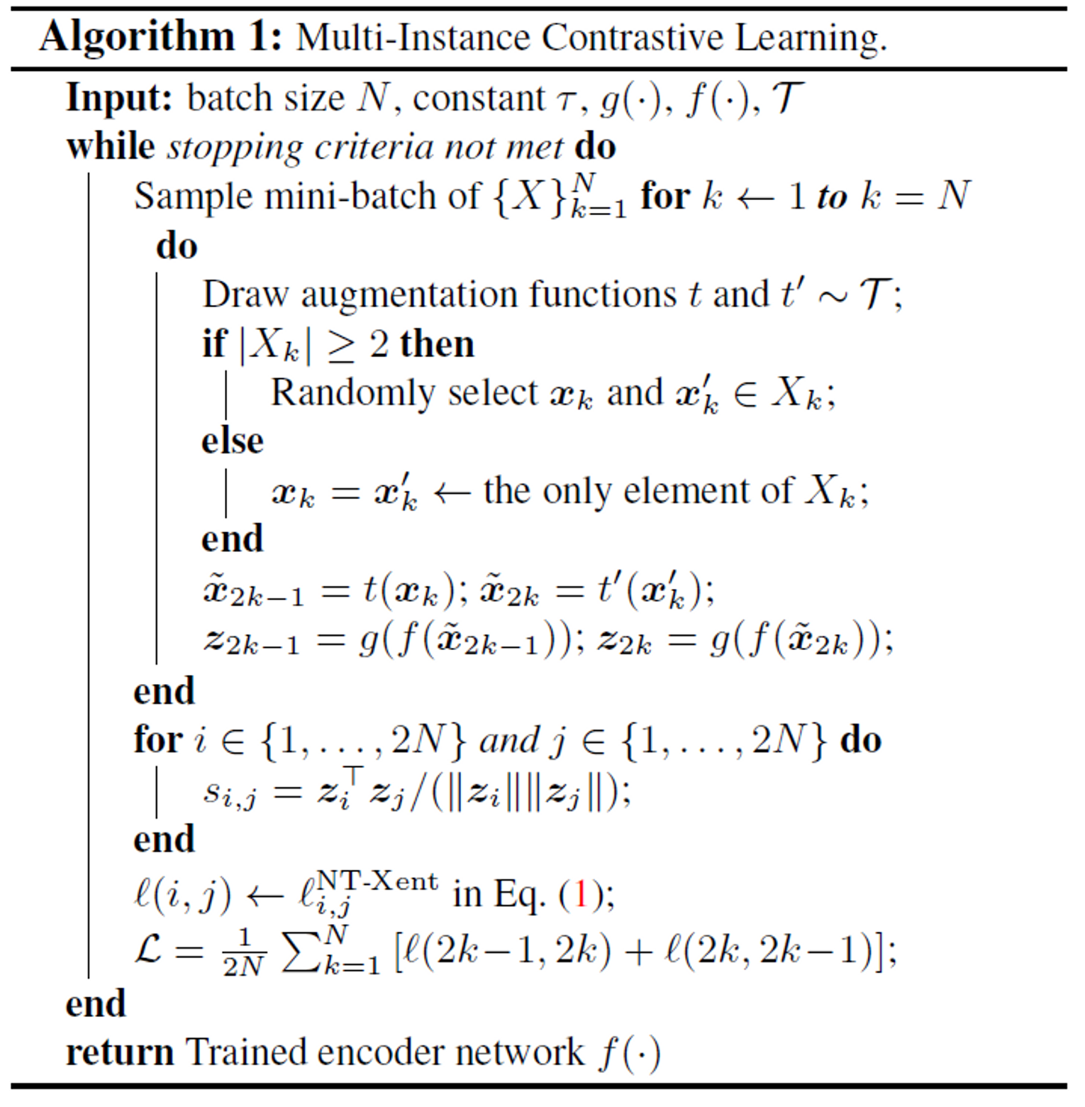 본 논문은 의료데이터를 다루는데, 의료데이터는 한 환자에 대해서 여러장의 image들이 존재하게 된다. 이러한 경우를 multi-instance 라고 하며, 본 논문은 Multi-Instance Contrastive Learning(MICLe)을 제안한다. MICLe은 수식 1의 InfoNCE loss를 사용하되, 기존의 positive sample을 동일한 이미지에서 획득된 transformed 이미지가 아닌 다른 이미지 이지만 동일한 환자에게서 획득된 이미지를 이용한다. Instance의 갯수가 2개 이상인 경우, randomly select하여 2개의 이미지를 뽑는다. pseudo code는 아래와 같다.