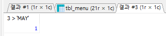 SELECT 3 > 'MAY'; -- λ¬Έμλ 0μΌλ‘ λ³νλλ€.