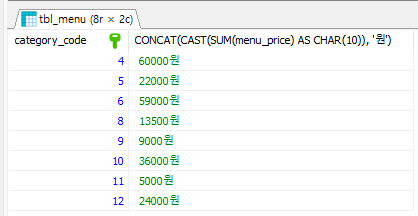 SELECT category_code, CONCAT(CAST(SUM(menu_price) AS CHAR(10)), 'μ') FROM tbl_menu GROUP BY category_code;