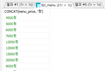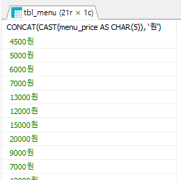 SELECT CONCAT(menu_price, 'μ') FROM tbl_menu; -- menu_priceκ° λ¬Έμλ‘ λ³νλ¨